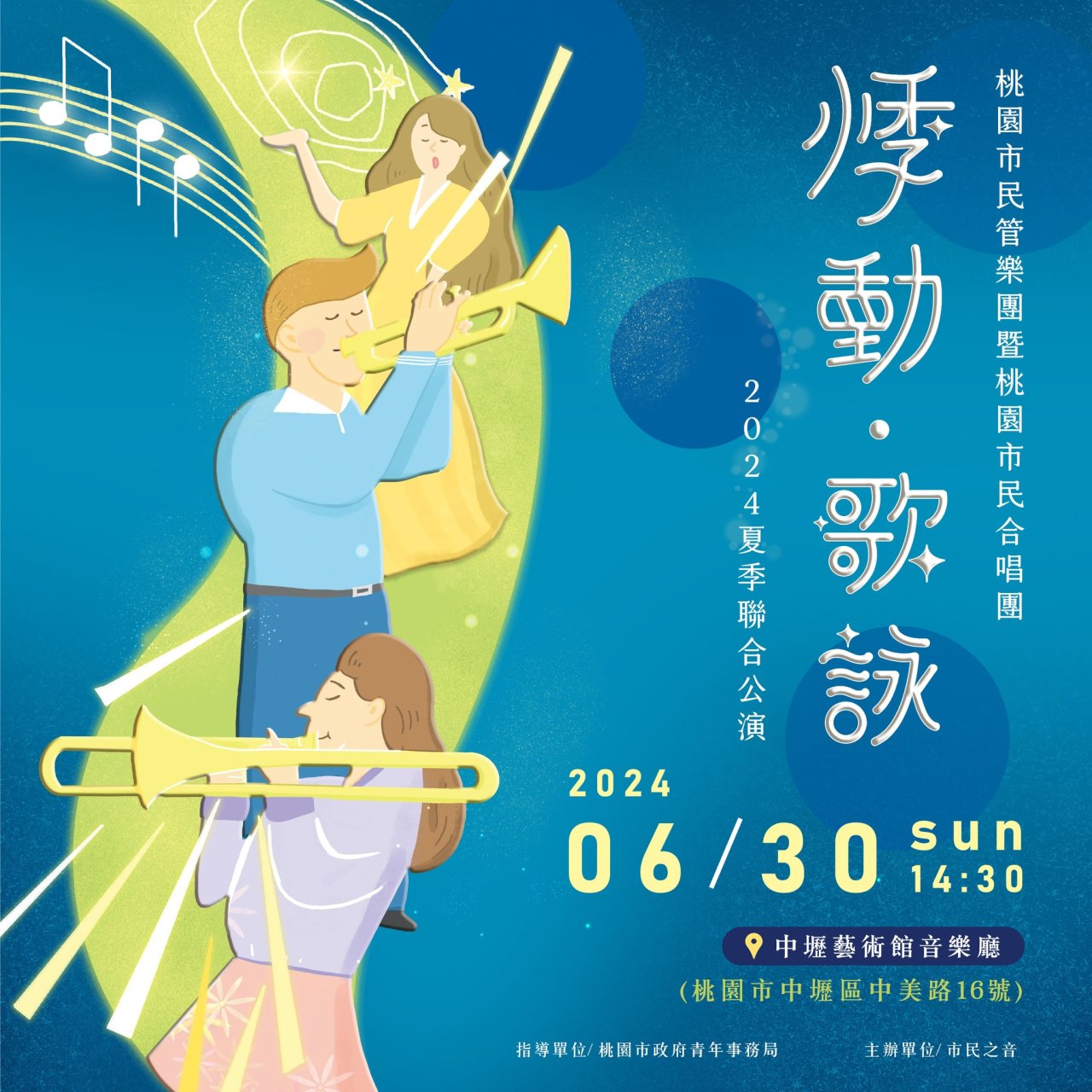 一、 | 活動介紹:桃園市民管樂團暨桃園市民合唱團夏季聯合公演《悸動‧歌詠》,節目中桃園市民管樂團將演繹《悸動與歌詠》《鐘樓怪人》《白朗峰》等管樂經典樂曲,而桃園市民合唱團也將帶來《聽海》《戇囡仔》...等悅耳歌謠,壓軸更由兩團共同演繹《安德魯‧洛伊‧韋伯的音樂會慶典》樂曲,節目內容精采可期!期盼與各位觀眾共渡美好的午後時光。 |