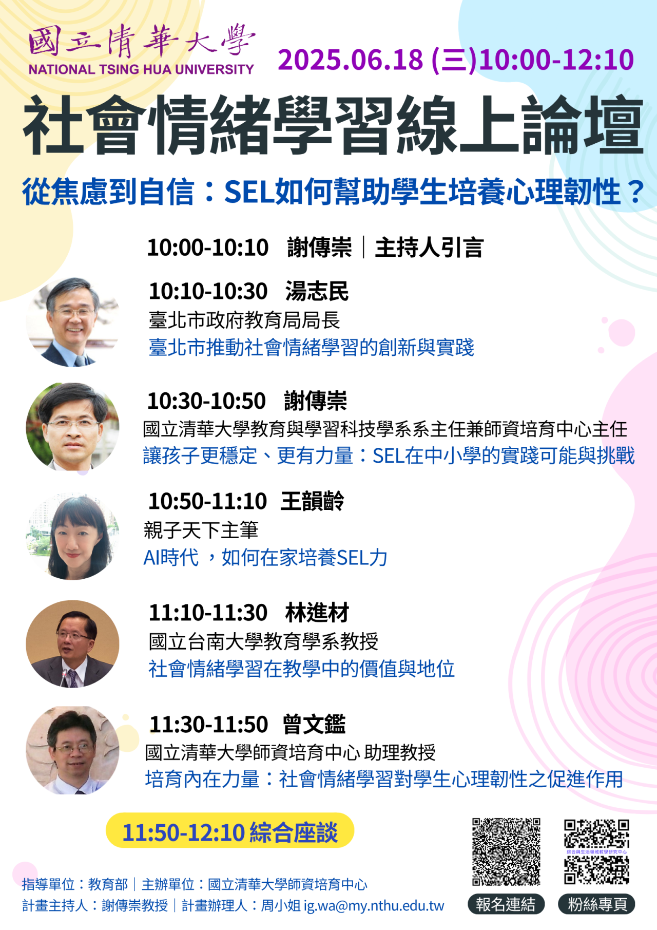 | 二、 | 該校師資培育中心舉辦之論壇為「社會情緒學習-從焦慮到自信:SEL如何幫助學生培養心理韌性?」,旨在探討如何透過系統性教學,培養學生的自我覺察、情緒管理、人際互動與責任決策能力。透過專家講座與實務交流,期能協助教師深化SEL理念與教學策略,進而促進學生全人發展,強化學校教育支持系統。 |