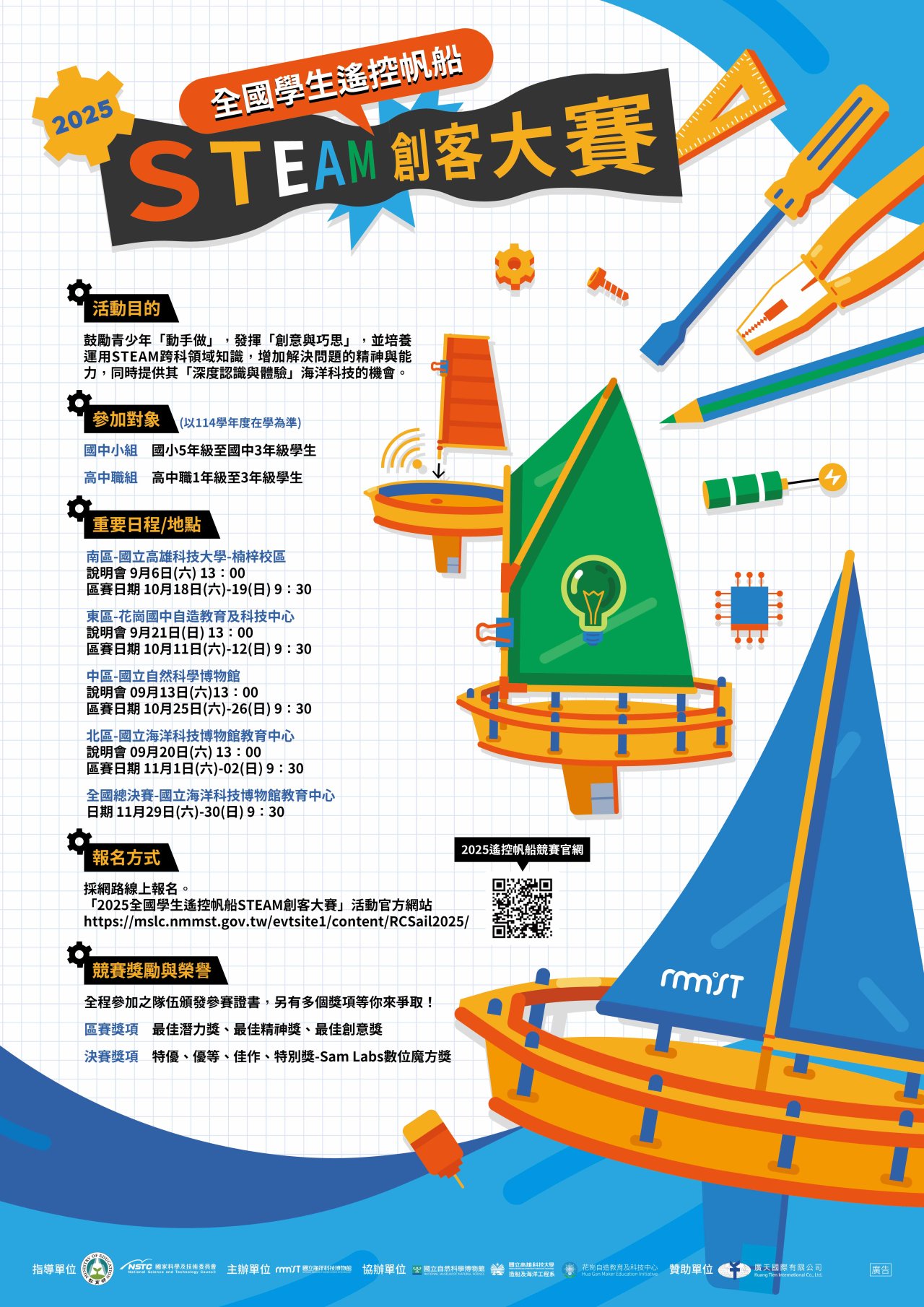 四、 | 活動詳情與報名請參閱活動簡章,或至「2025全國學生遙控帆船STEAM創客大賽」活動官網https://mslc.nmmst.gov.tw/evtsite1/content/RCSail2025/ |