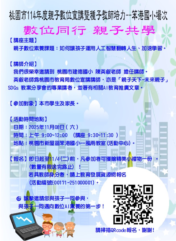 | (五) | 報名方式:請於114年11月04日(星期二)中午12時前至 google表單報名。(報名連結 https://forms.gle/Zyb472Zdi4mdPvVu8),若具教師身分者,請上桃園市教育發展資源入口網報名 (活動編號E00171-251000001)。 |