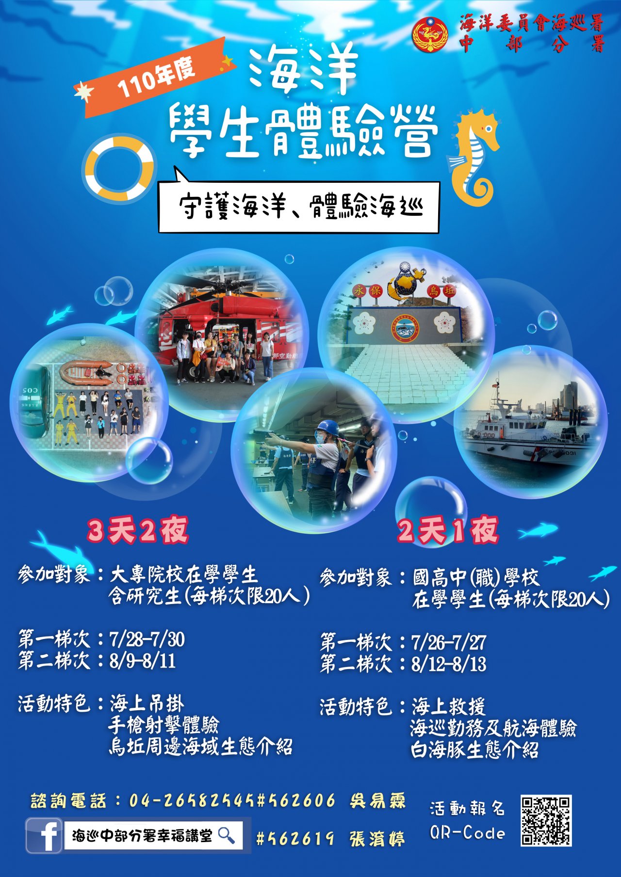 海洋委員會海巡署中部分署辦理「海洋委員會110年海洋學生體驗營-親近海洋、體驗海巡」活動電子文宣(EDM)及簡章各1份,請查照。