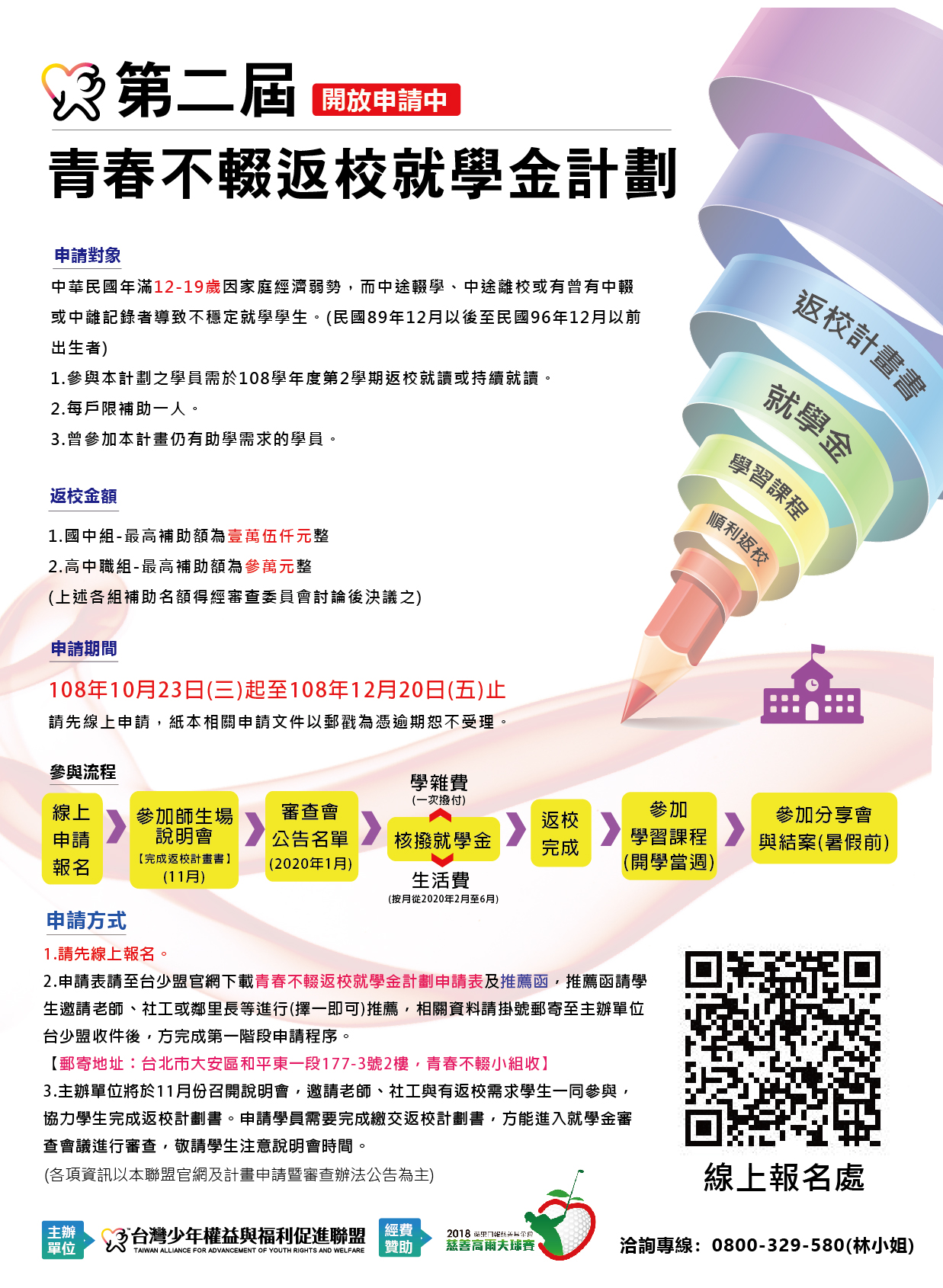 二、旨揭計畫申請對象為年滿12-19歲,因家庭經濟問題而暫時離開學校之國、高中職中途輟學或中途離校或中途輟學、中途離校之虞之學生,為助其早日返校完成學業,該聯盟特成立「青春不輟返校就學金計劃」,提供其返校期間所需之生活費及學雜費用。請貴單位協助轉知或公告相關申請辦法,並主動推介適合申請之學生。
