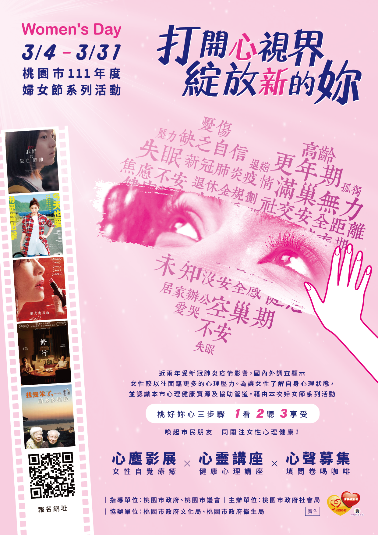 | 二、 | 近兩年受新冠肺炎疫情影響,國內外調查顯示女性較以往面臨更多的心理壓力,本市111年度婦女節系列活動以關注「女性心理健康」為主軸,透過「桃好妳心三步驟 1看2聽3享受」辦理心靈講座、心塵影展及心聲募集活動,讓女性了解自身心理狀態,並進一步認識心理健康資源及協助管道。 |