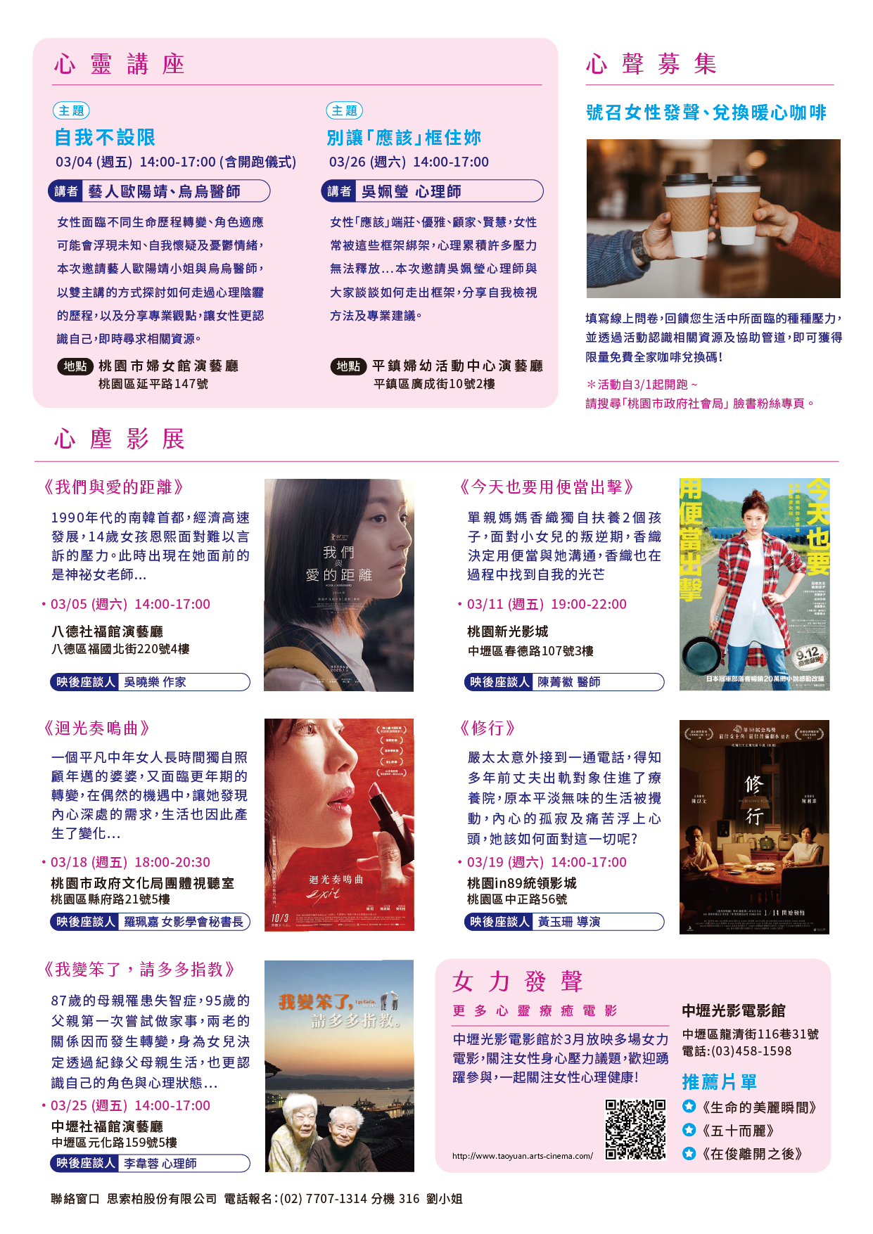 | 三、 | 前揭婦女節系列活動共計辦理2場心靈講座及5場心塵影展(含映後座談),活動報名連結https://lihi1.com/jPtmy。 |