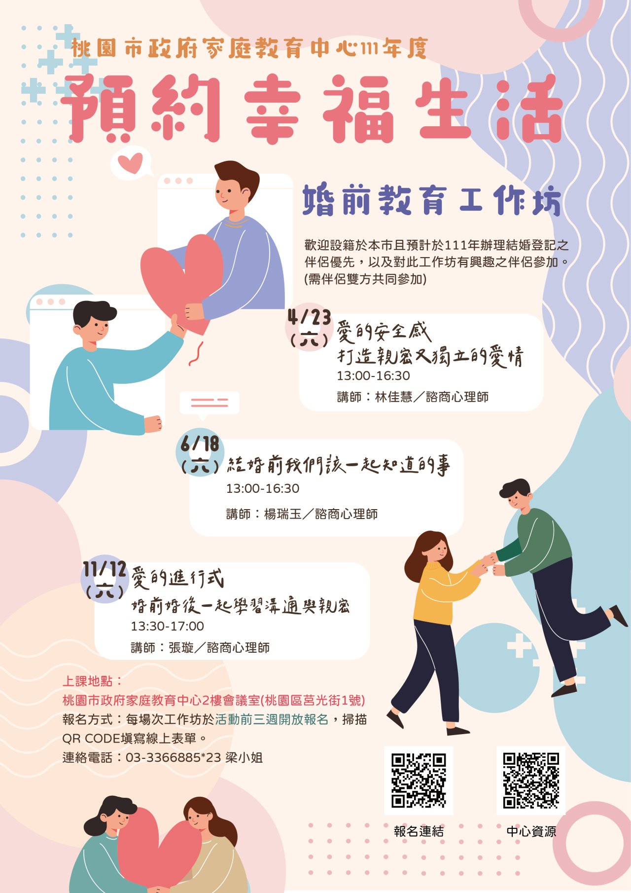 | 一、 | 依據桃園市政府家庭教育中心111年度預約幸福生活-婚前教育工作坊實施計畫辦理。 |