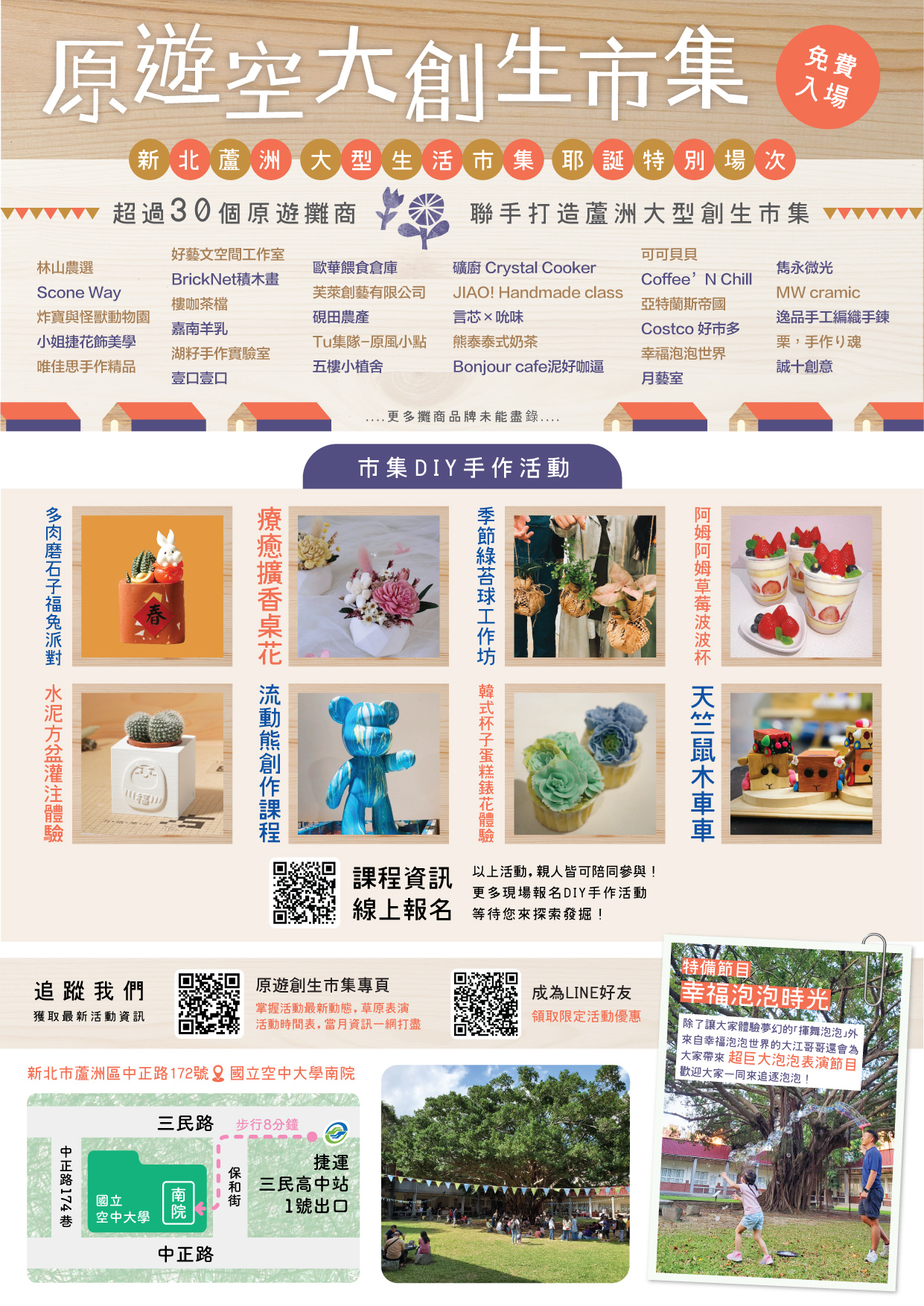 | 一、 | 今年度「原遊空大.創生市集」活動將於2月25日熱烈登場,生活市集集結超過30家地方特色攤商提供食、買、玩及親子手作DIY等活動。本市集竭誠歡迎民眾及親子家庭前來老榕樹下草原區野餐漫遊,一起度過美好親子假日時光。 |