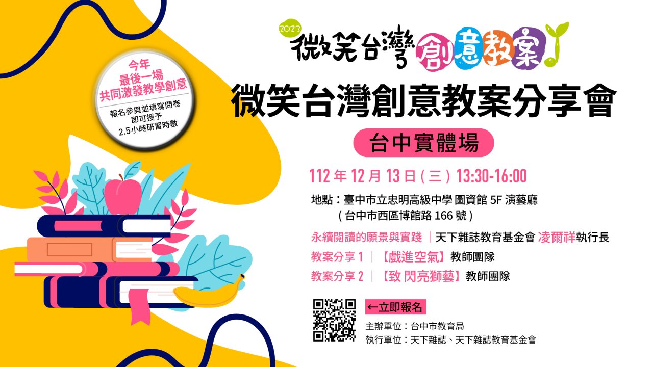| 二、 | 旨案訂於112年12月13日(星期三)舉辦「微笑台灣創意教案分享會-臺中實體場」,本活動將邀請國內教育專家學者與創新教案研發教師為講師,分享教育趨勢、提供多元的教學方案與策略,做為教師課程規畫之參考借鑑。 |