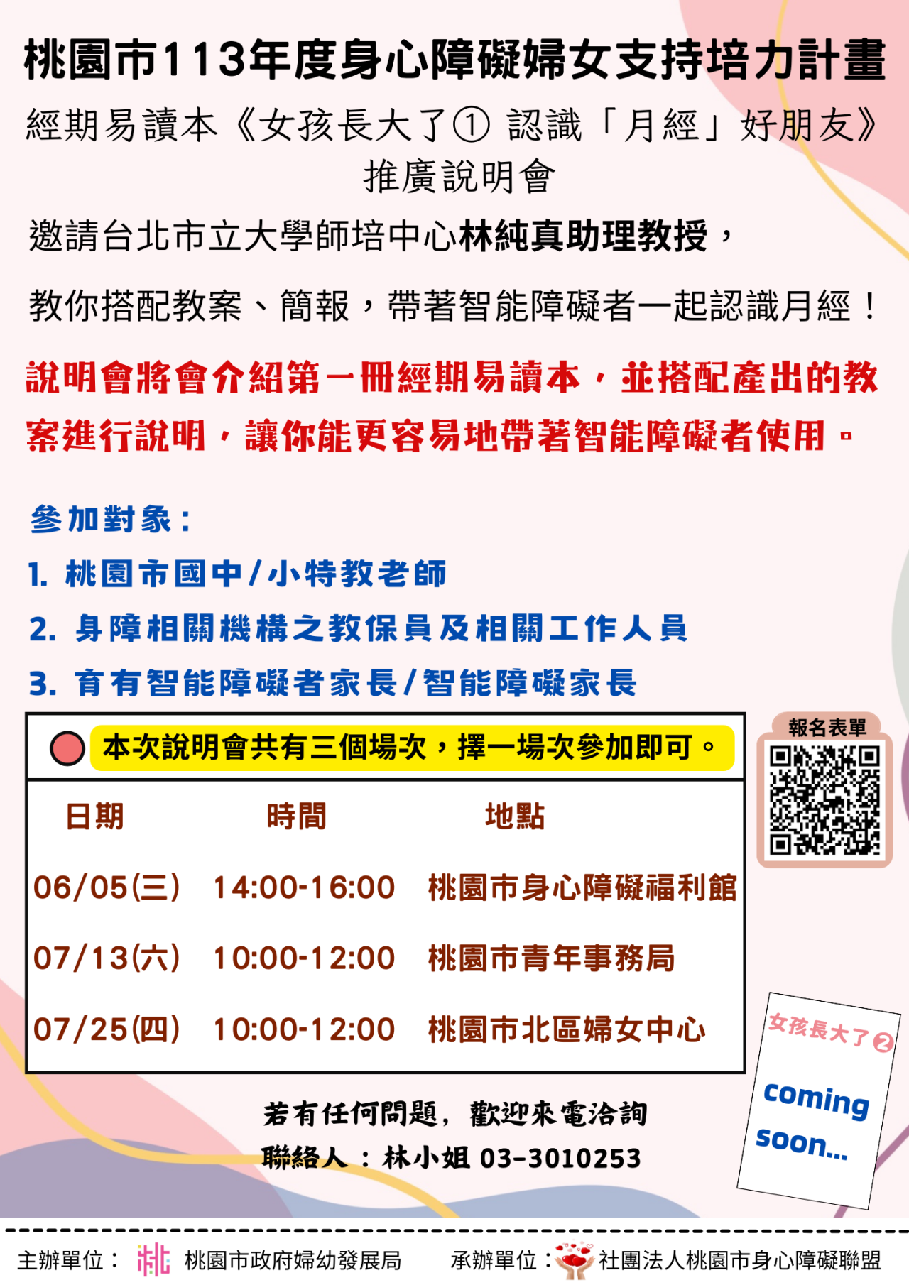 二、為提升智能障礙女性資訊近用權,本府婦幼發展局委託社團法人桃園市身心障礙聯盟針對智能障礙女性月經議彙編經期自我照護手冊易讀版,並辦理該手冊推廣說明會,以促進本市相關專業人員及智能障礙家長對手冊操作及使用的認識,請貴校踴躍報名參加,旨揭說明會辦理時間、地點如下: