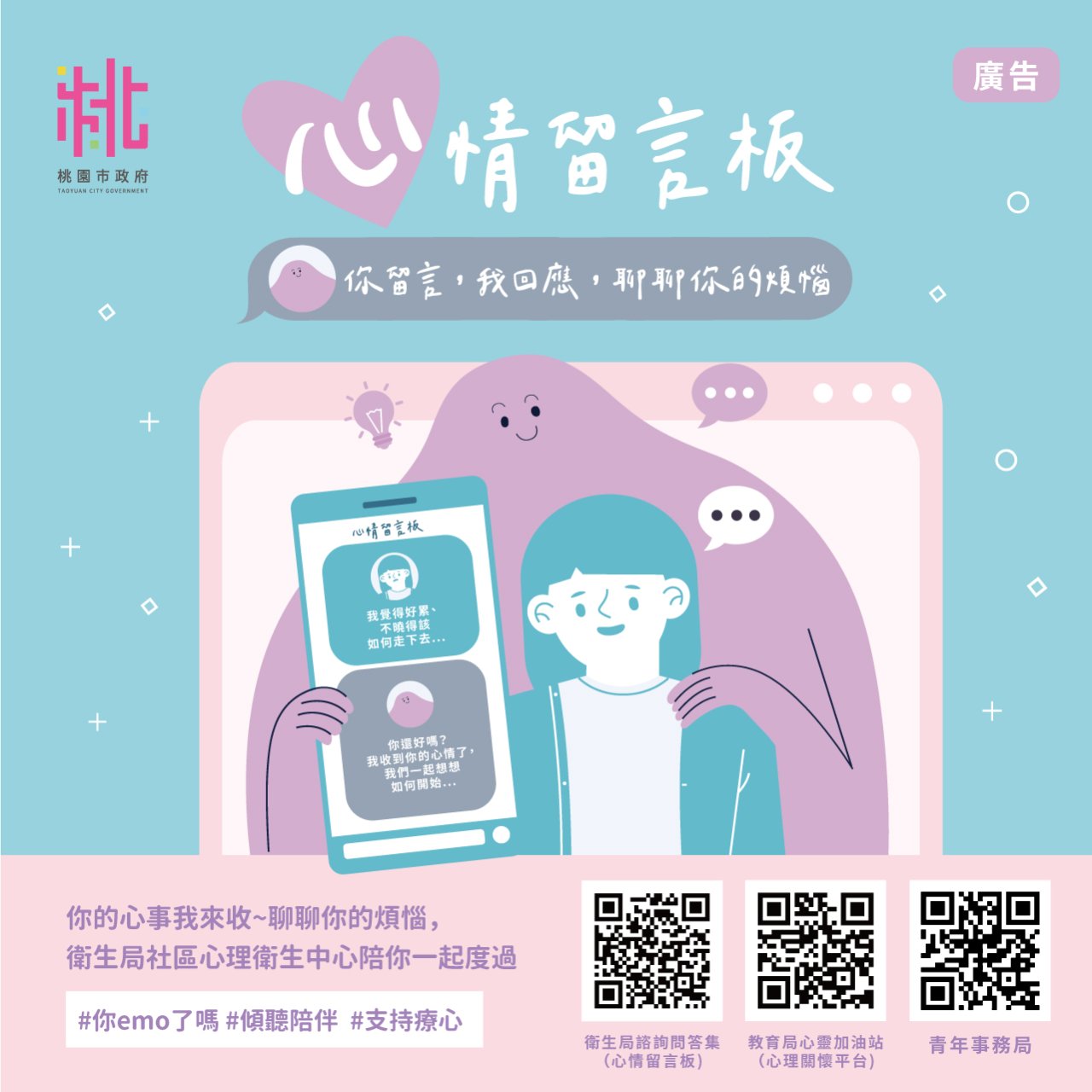 三、 | 檢附旨揭海報電子檔(附件1至2),該檔案亦可至本府衛生局社區心理衛生中心網站 (https://mental.tycg.gov.tw/)/諮詢問答集(心情留言板)/海報下載,請轉知所屬推廣運用。 |