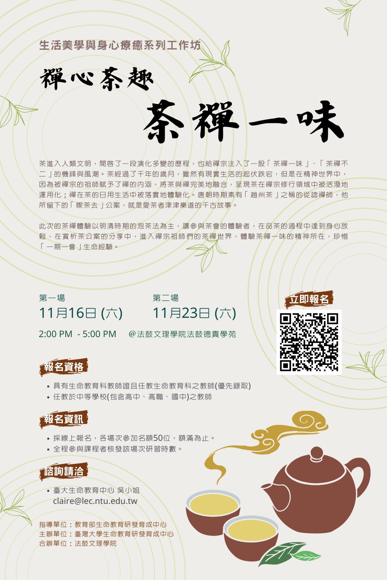 轉知~國立臺灣大學生命教育研發育成中心辦理「生活美學與身心療癒系列工作坊-茶禪一味」簡章