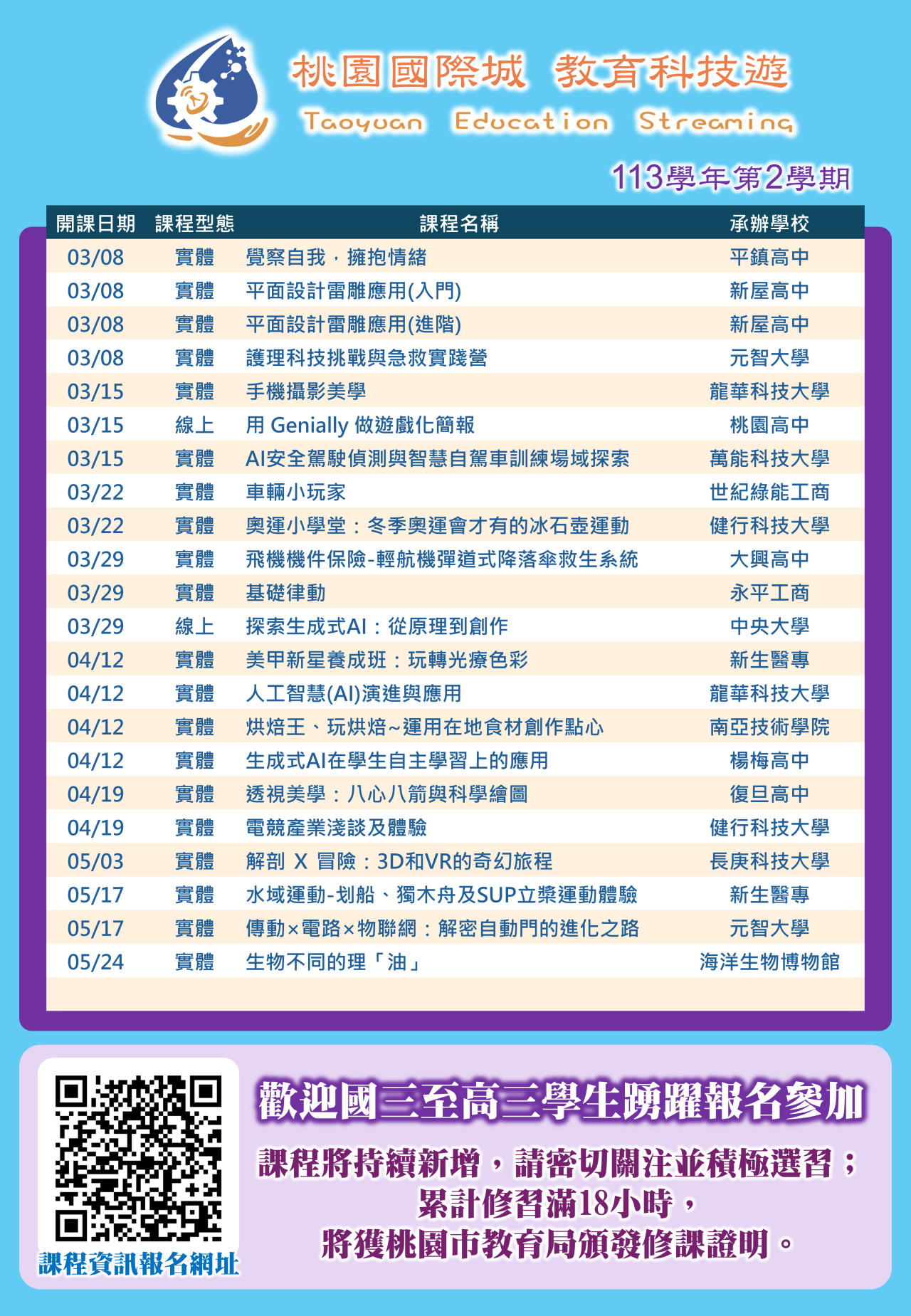 三、 | 檢附113學年度第2學期「桃園國際城 教育科技遊」課程海報1份。 |