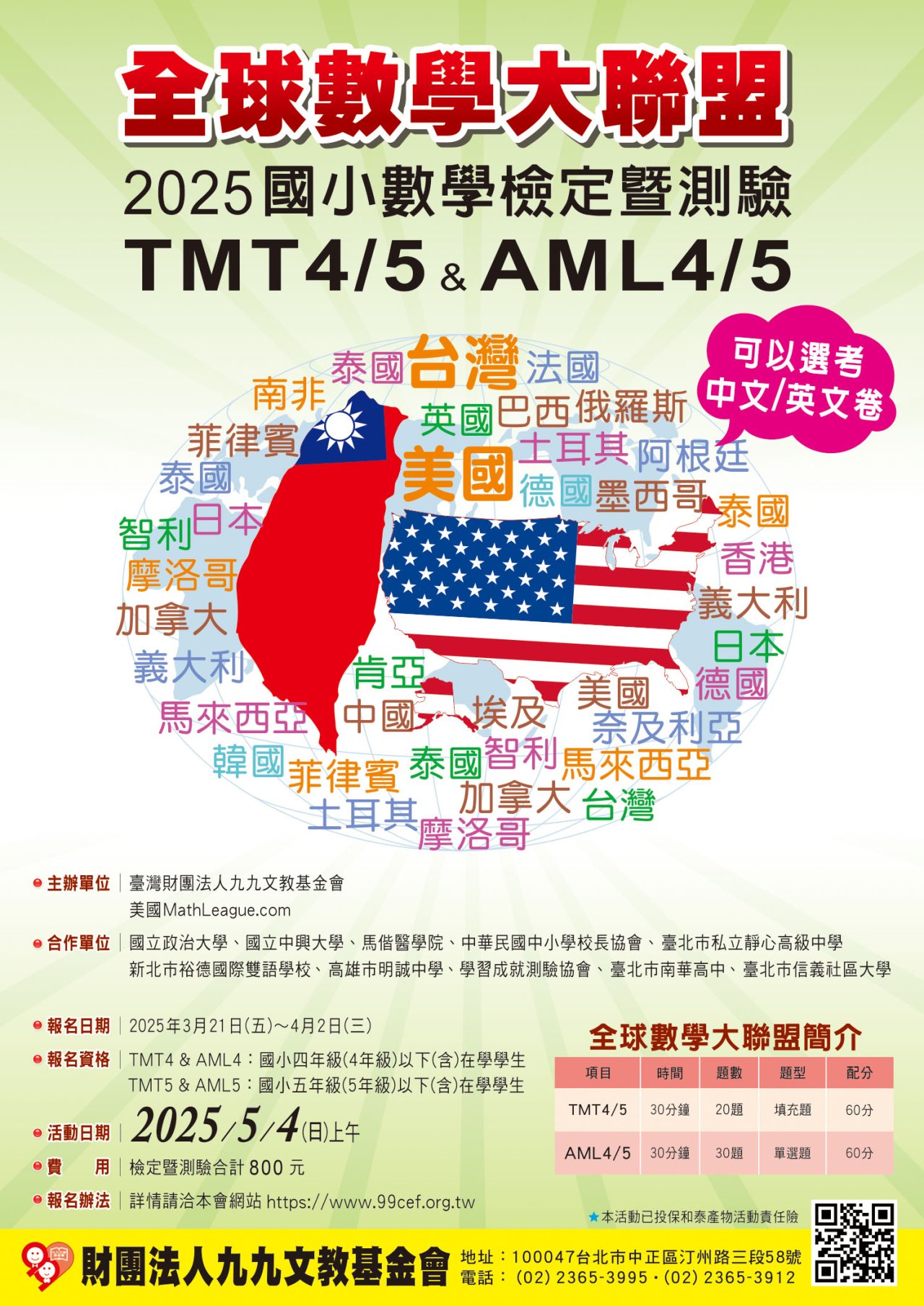 轉知「全球數學大聯盟 2025國小數學檢定暨測驗 TMT4/5 & AML4/5」