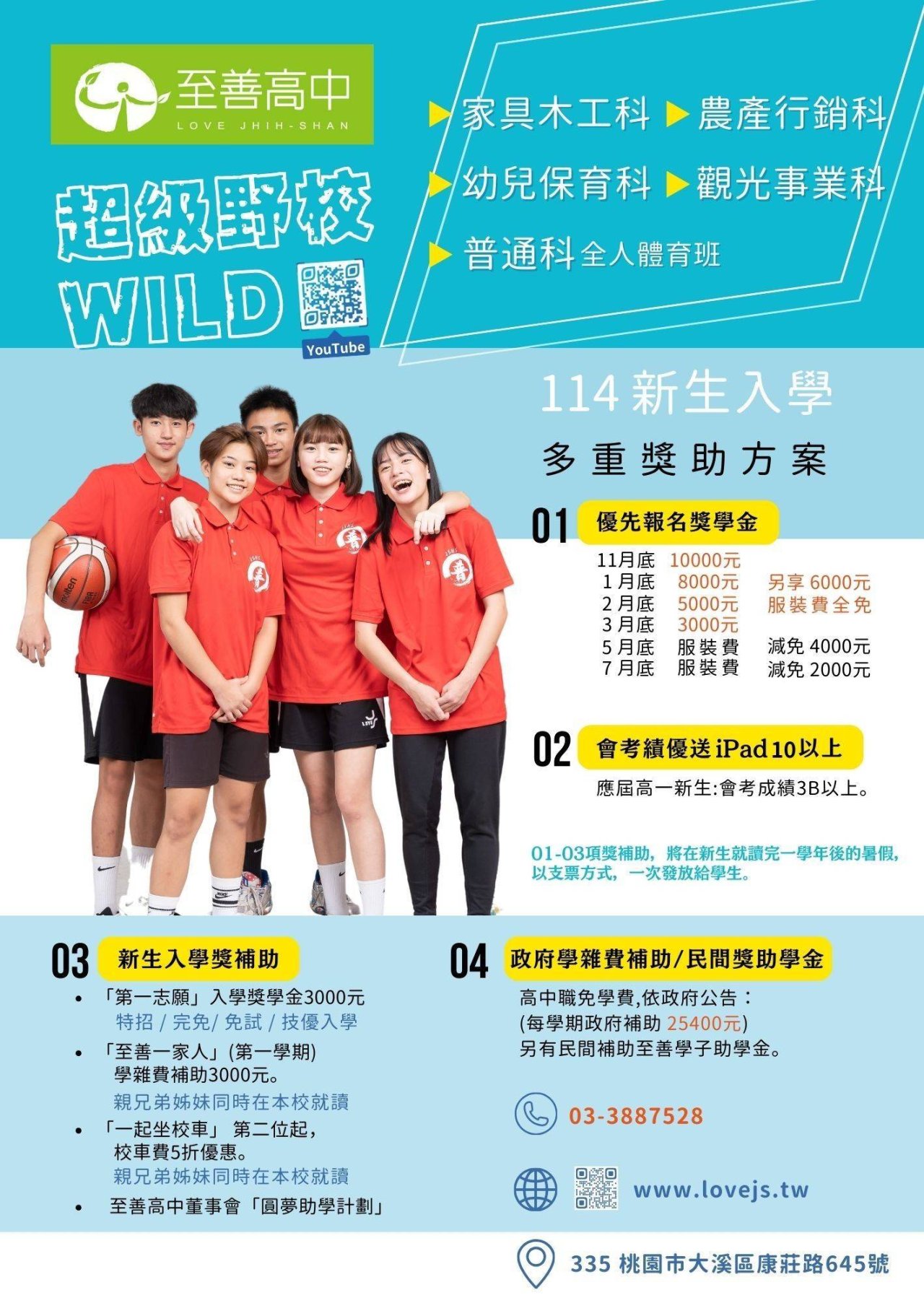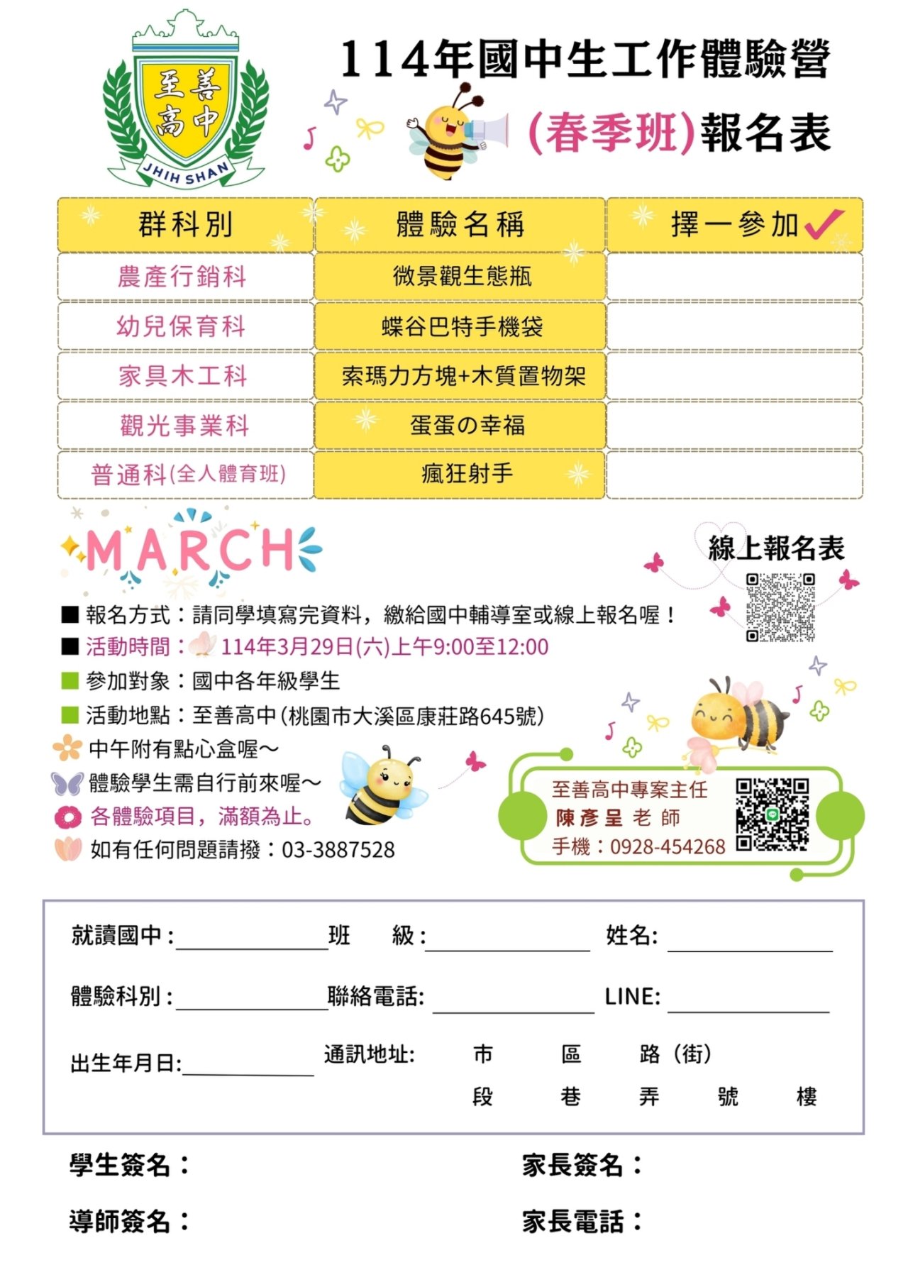 一、 | 至善高中『國中生體驗營(春季營)』介紹: 本校一年四季皆會辦理國中生體驗營,從去年至今已辦理6場次,累積人數已達300人以上,歡迎國中生/家長來到桃園大溪至善高中,來體驗北台灣唯一「家具木工科」、全國唯一「農產行銷科」、手作強項「幼兒保育科」、觀光小鎮「觀光事業科」、普通科(全人體育班)」,5個特色科系所帶來的獨有手作課程,讓孩子們多元探索內在興趣,早日找到屬於自己的方向!本活動含中午用餐全程免費;活動結束後,也可到大溪老街、石門水庫走走唷! |
