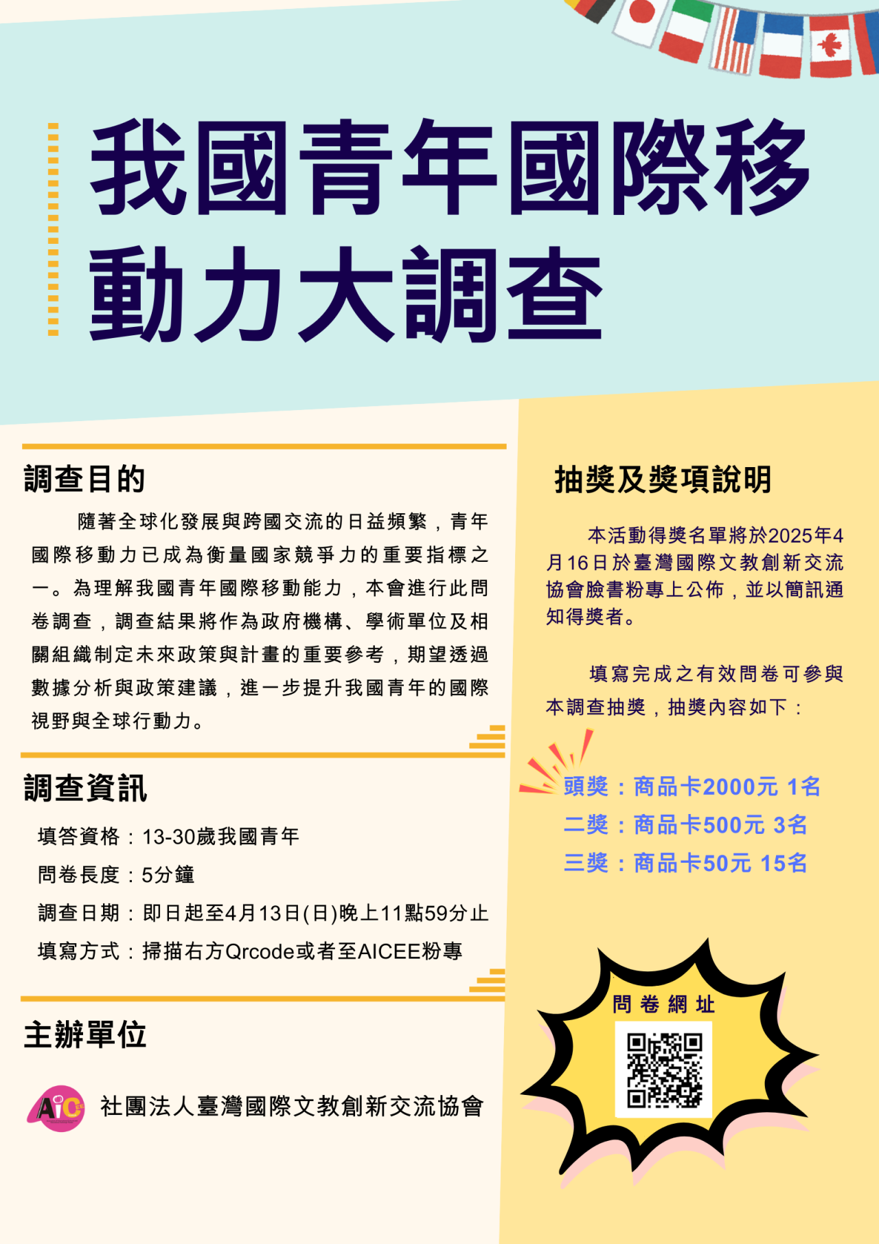 轉知臺灣國際文教創新交流協會辦理「我國青年國際移動力大調查」抽獎問卷活動(調查對象為13至30歲)