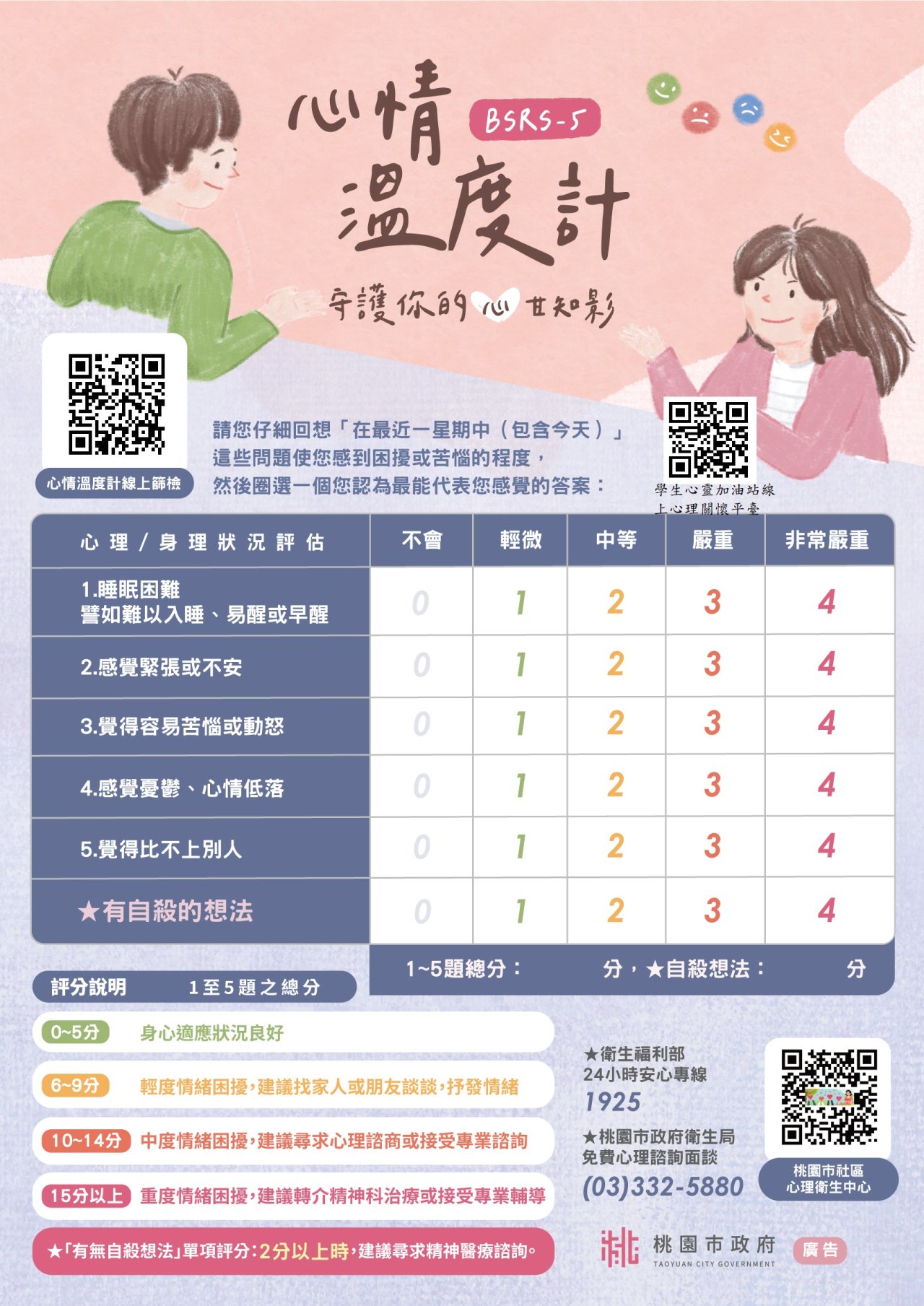 - 篩檢網址(https://forms.gle/5dRpnh1qpXkNaX6x9),併檢送心情溫度計海報1份,供學生自評心情狀況。