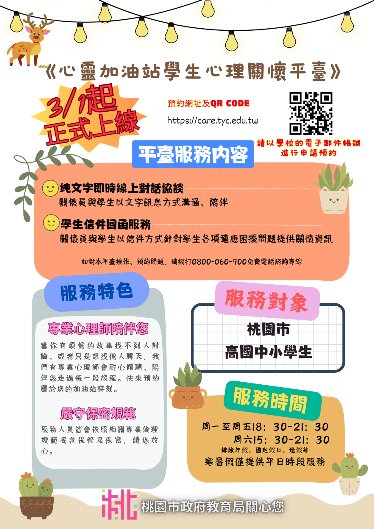 - 倘學生施測後有心理健康議題諮詢需求,得使用本局建置之「心靈加油站學生心理關懷平臺(網址:https://care.tyc.edu.tw/)」服務項目。