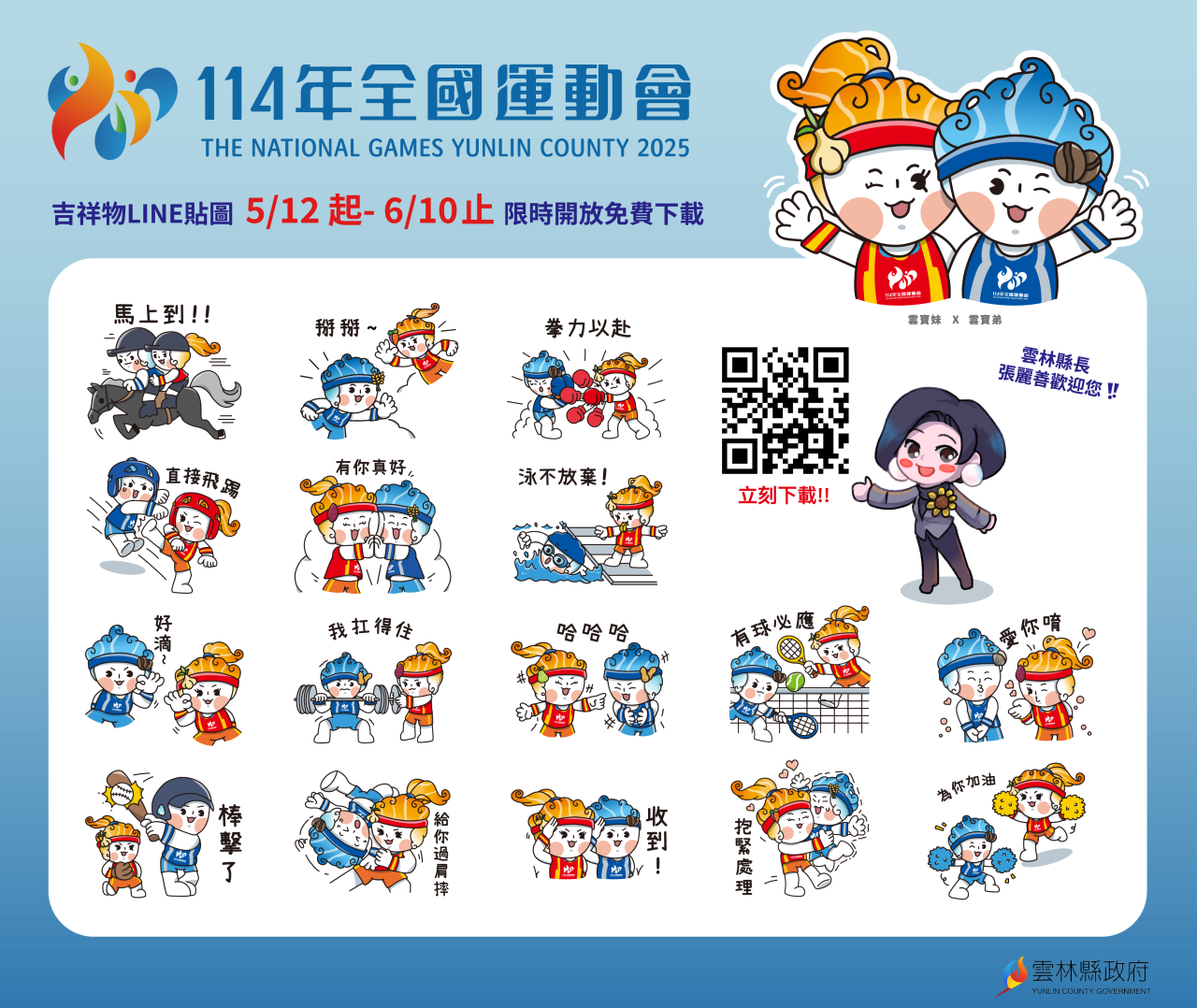 轉知雲林縣政府製作「114年全國運動會在雲林」LINE貼圖,歡迎免費下載使用