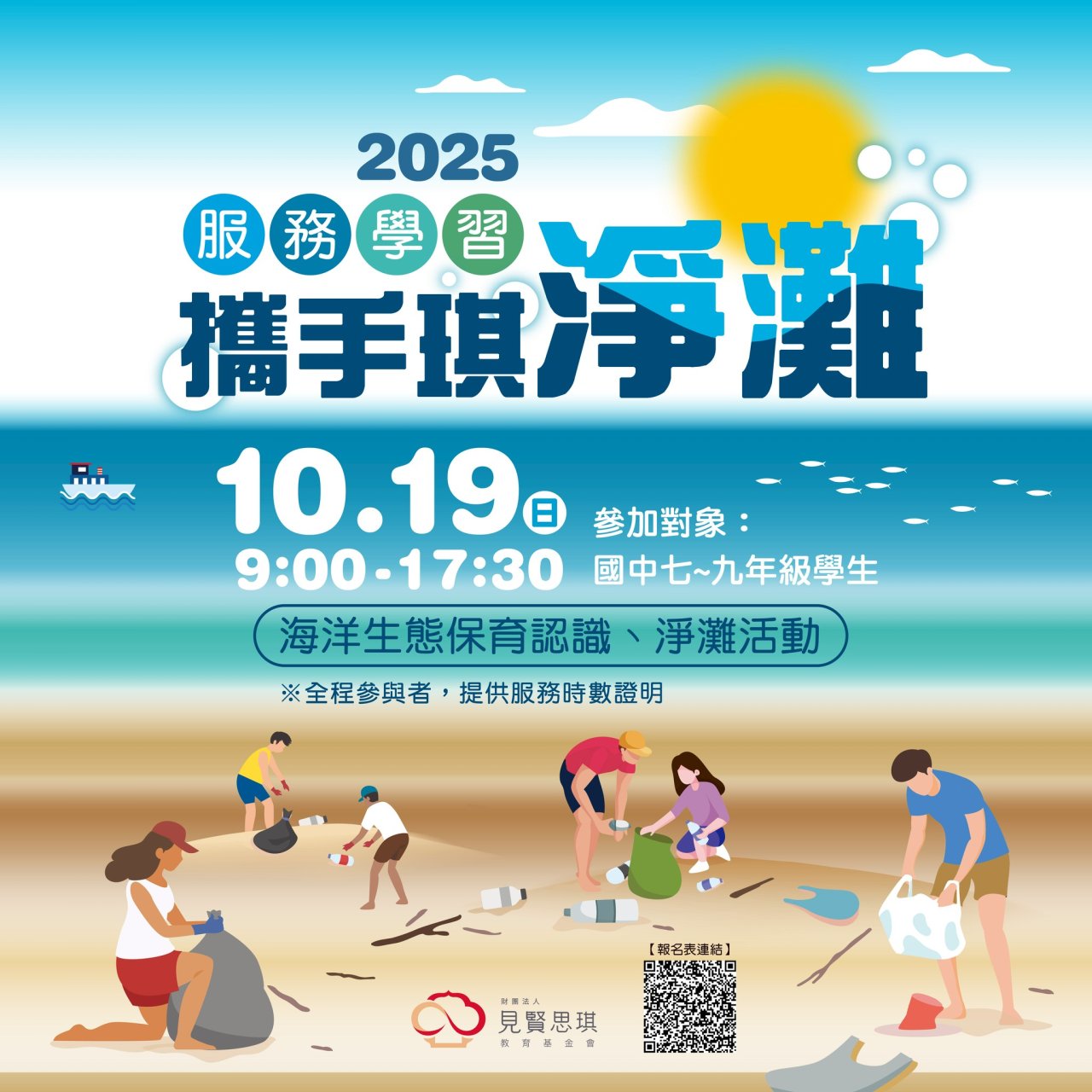 一、 | 本會辦理「2025服務學習-攜手琪淨灘」服務學習活動,透過做中學提供社會參與機會,增進青少年對公共議題的關心,豐富其學習視野,歡迎青少年踴躍參與。 |