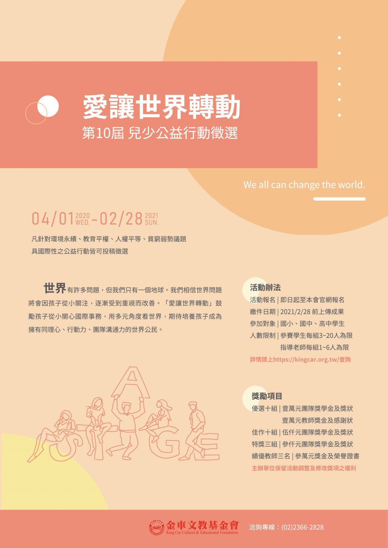 轉知財團法人金車文教基金會「愛讓世界轉動 兒少公益行動」2020第十屆徵選簡章訊息