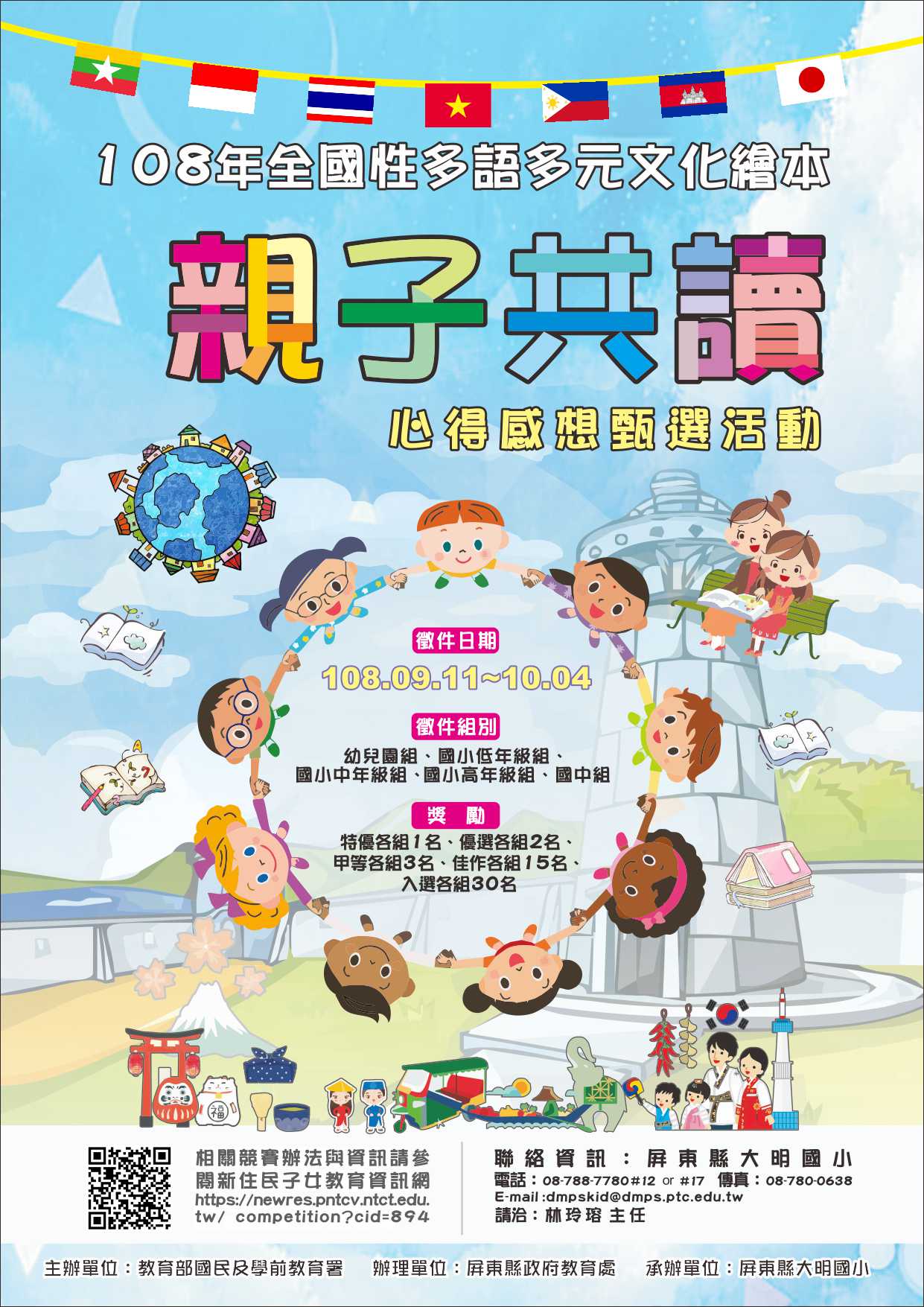 四、檢送「108年全國性多語多元文化繪本親子共讀心得感想甄選活動海報」1份。