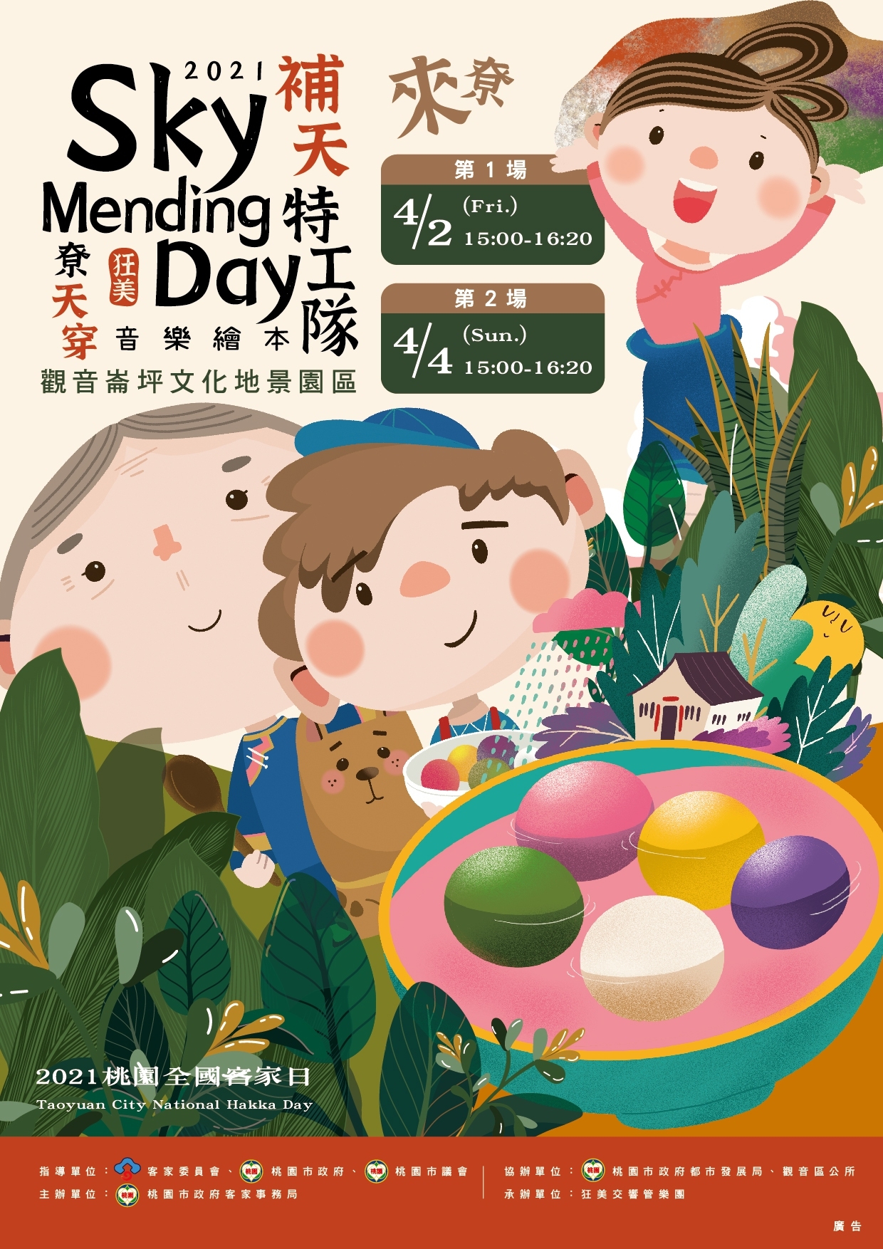 一、為歡度崙坪文化地景園區客家兒童日,本局邀請狂美交響管樂團於本(110)年4月2日及4月4日辦理親子音樂繪本展演「補天特工隊」,將結合趣味戲劇、全彩繪本、專業演唱及現場樂團演奏,獻上一齣富有客家文化意涵的親子音樂劇。