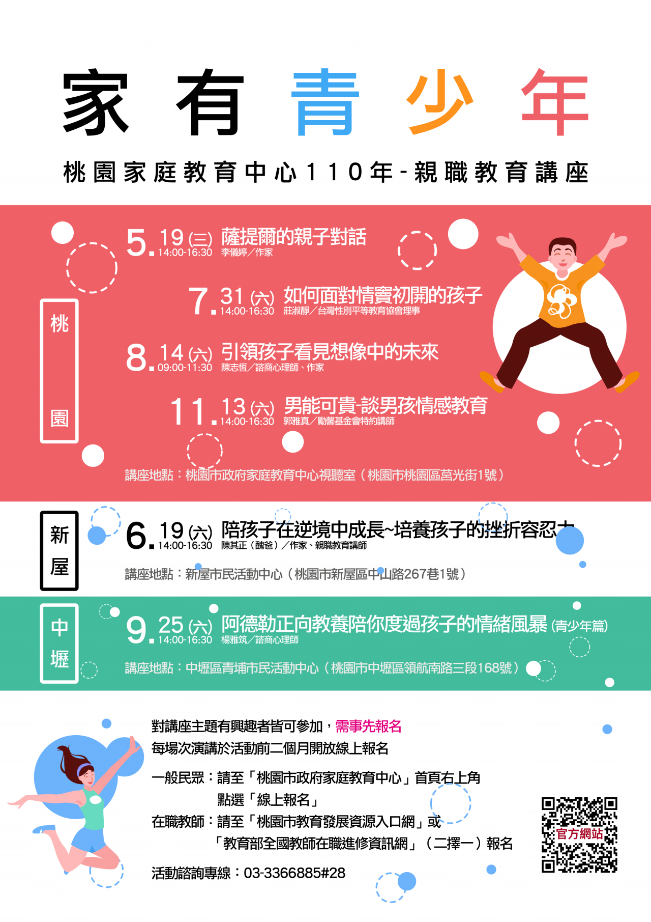 家有青少年—親職教育講座:活動資訊詳如簡章,每場次講座全程參與者可登錄「愛的存款簿」、「公務人員終身學習時數」及「教師研習時數」3小時。