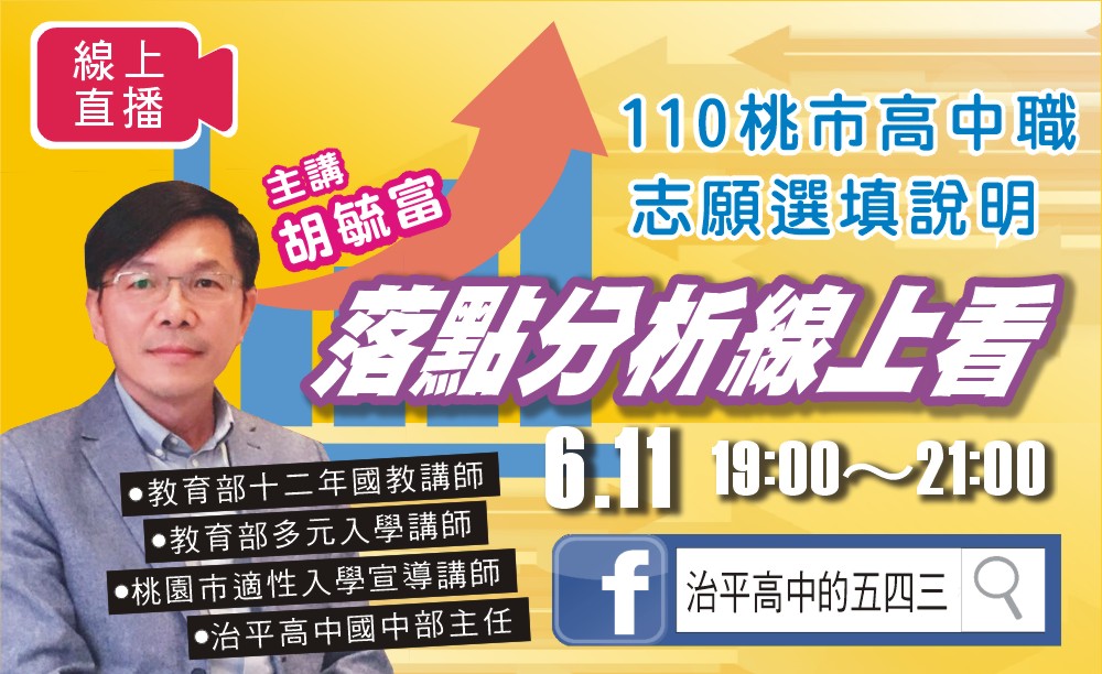 轉知治平高中辦理 「110學年度桃園市高中職志願選填說明會-落點分析」,歡迎九年級家長參與線上說明會。