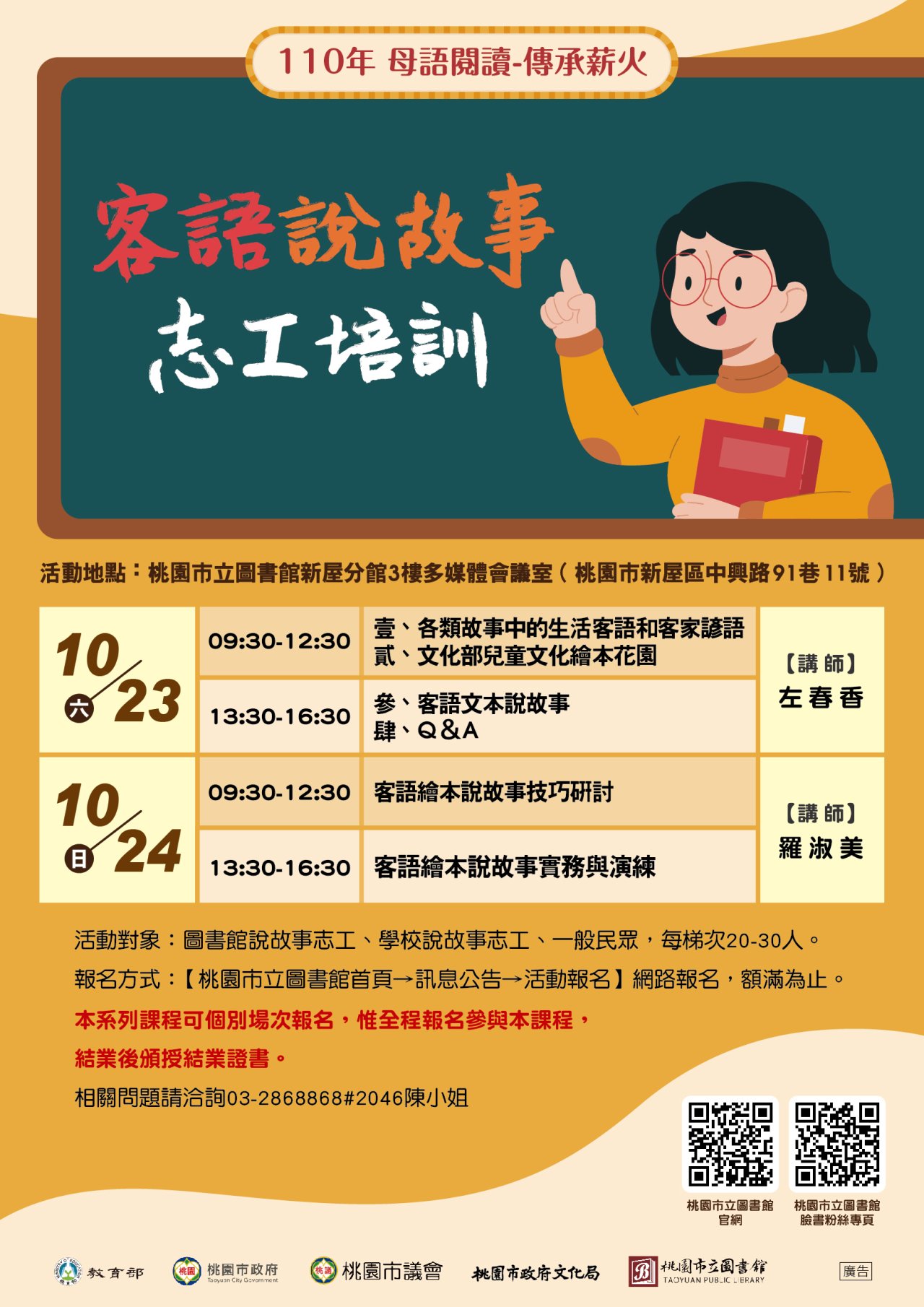 一、旨揭課程訂於110年10月23日及10月24日於本館新屋分館3樓多媒體會議室(新屋區中興路91巷11號)辦理,全程參與兩日課程之民眾將提供研習證明,可提供日後圖書館客語說故事志工面試所需,報名時間自即日起至110年10月21日止,於本館官網報名。