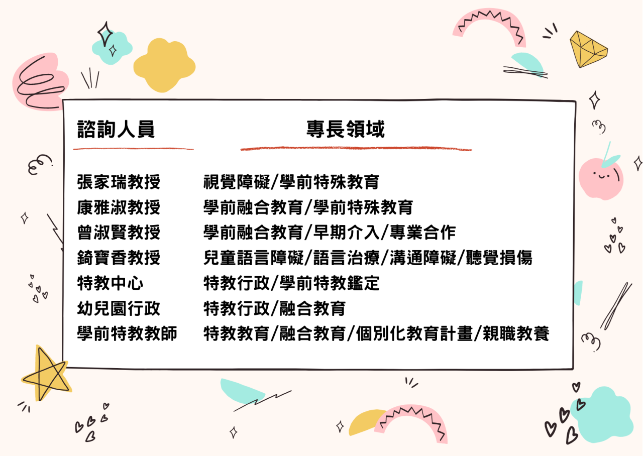 三、本專區將持續更新,透過諮詢服務,協助家中有特殊幼兒之父母,期使讓身心障礙幼兒獲得及早與適性的特殊教育與相關支持服務。