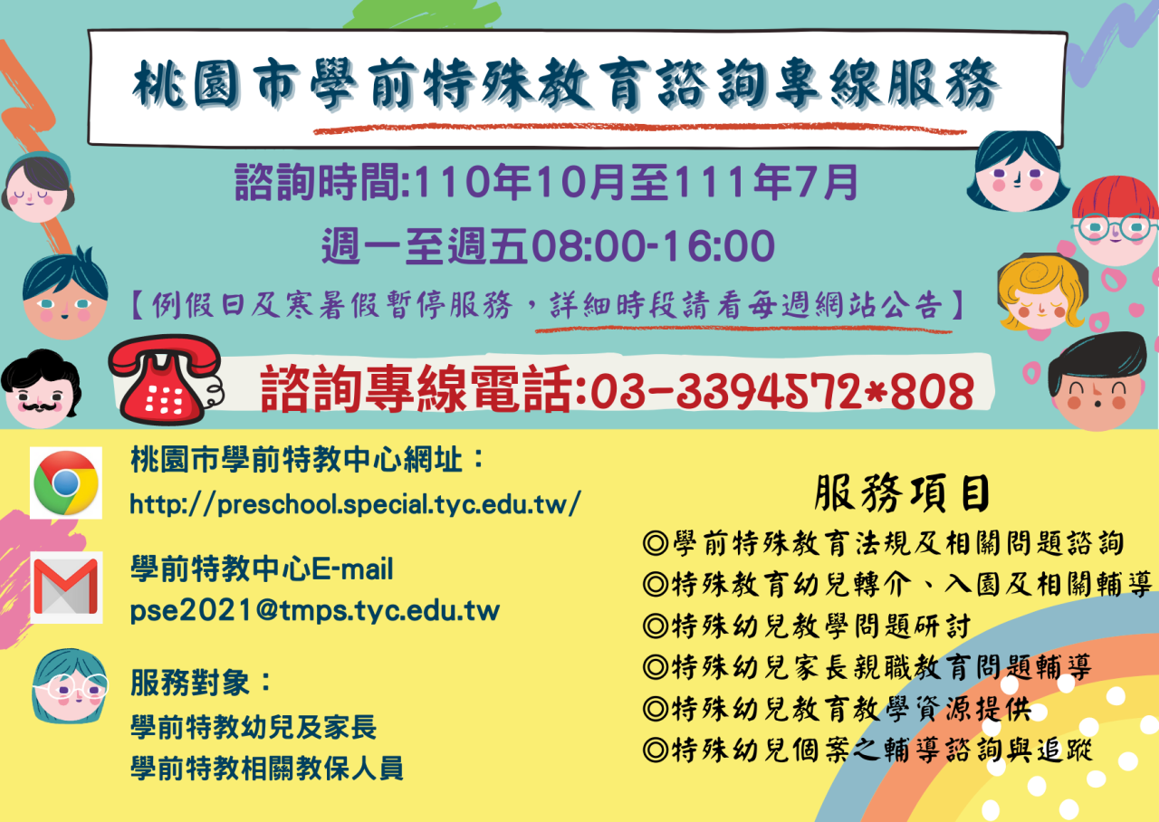 轉知桃園市政府教育局110學年度成立「學前特殊教育諮詢服務據點」。