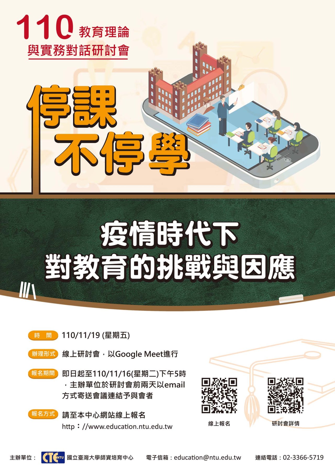 轉知~國立臺灣大學「110年教育理論與實務對話:『停課不停學:疫情時代下對教育的挑戰與因應』研討會」