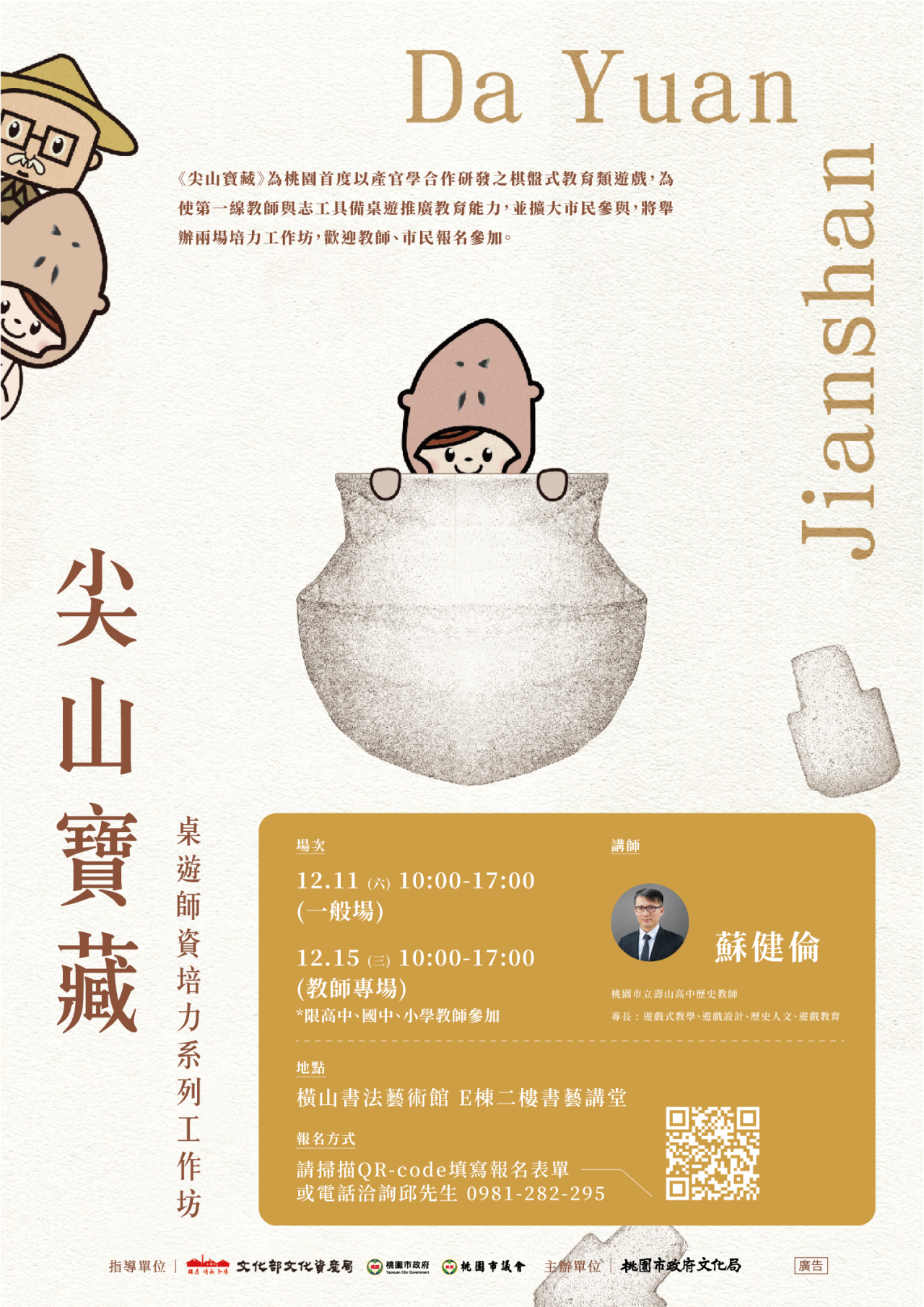 三、 | 旨案研習課程邀請桃園市立壽山高級中等學校歷史教師蘇健倫講授與介紹「尖山寶藏-大園尖山遺址考古趣」桌遊,歡迎教師參與。 |