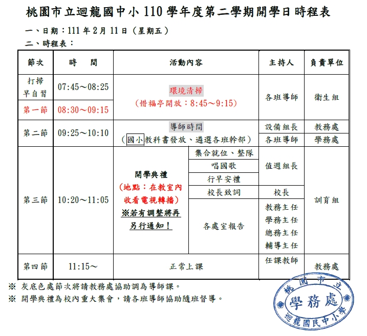 1.2/11(五)開學日為正常上放學時間,請於7:45前到校,一~四年級12:35放學、五~六年級13:55放學、國中部15:45放學,當天皆會在校用午餐,請攜帶餐盒。