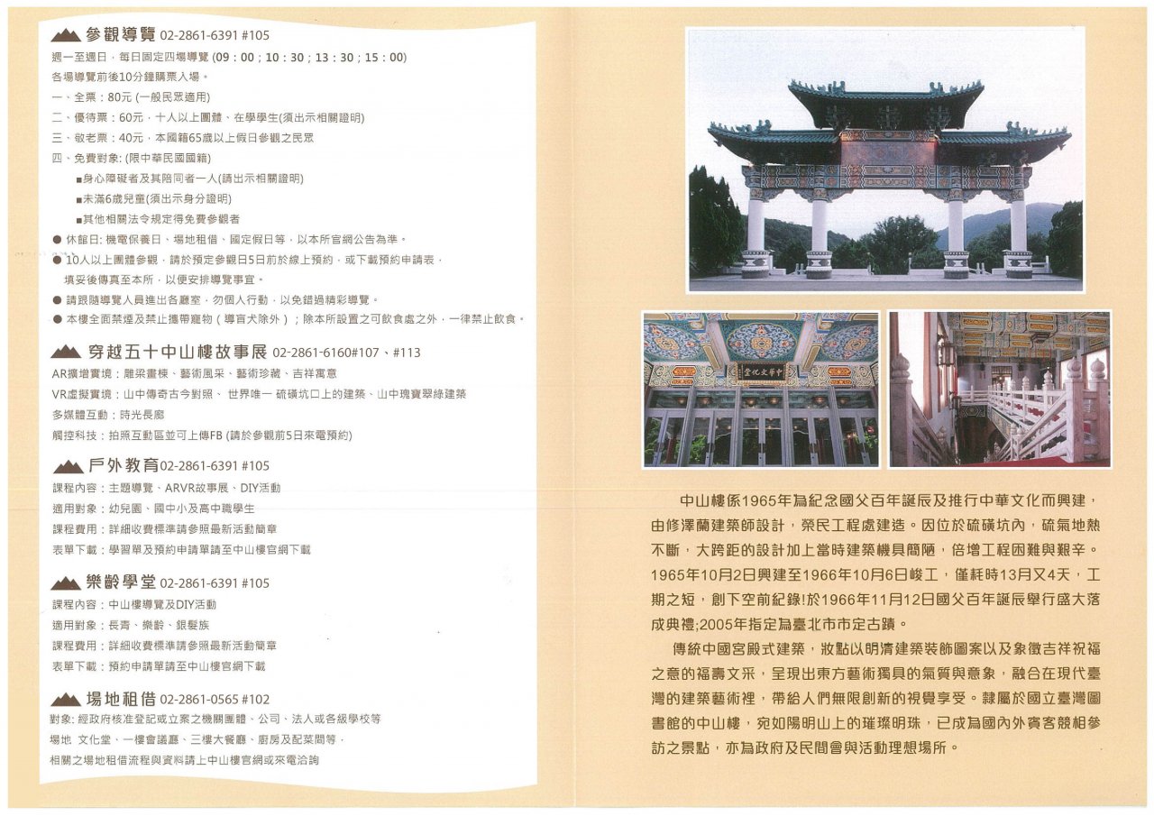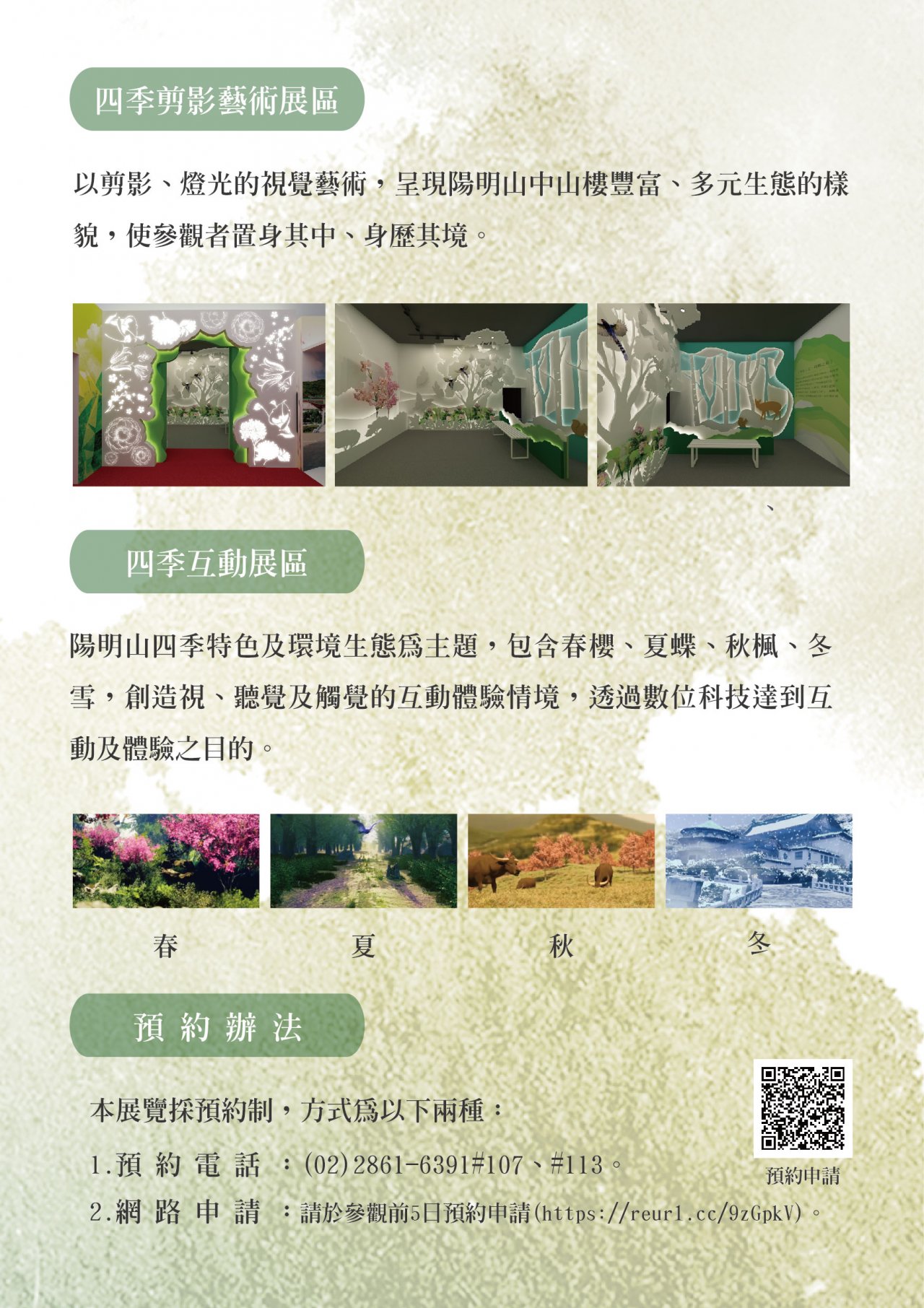 (一)特展參觀:最新開幕之「中山樓創藝之旅 四季互動特展」,以陽明山國家公園內四季特色為主題,透過剪影藝術與多媒體數位互動裝置,呈現中山樓春櫻、夏蝶、秋楓、冬雪風情(如附件)。意者請於參觀前五日預約,參觀後填寫問卷即可兌換精美小禮品1份,預約方式可進入中山樓官網填寫線上表單(連結網址https://reurl.cc/9zGpkV)亦可撥打專線電話:(02)2861-6160#107或#113。