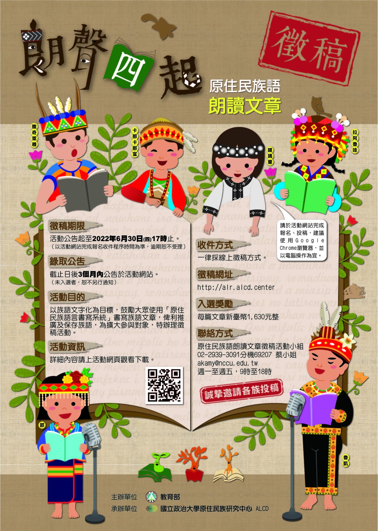 轉知:有關國立政治大學原住民族研究中心辦理教育部「原住民族語朗讀文章徵稿活動」一案