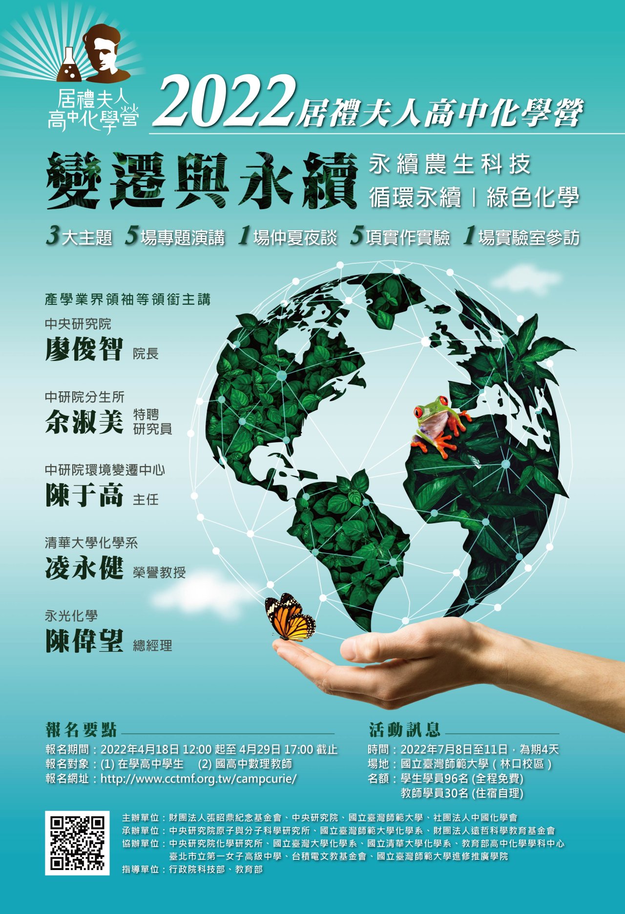 轉知教育部國民及學前教育署函轉中國化學會辦理「2022居禮夫人高中化學營」活動資訊