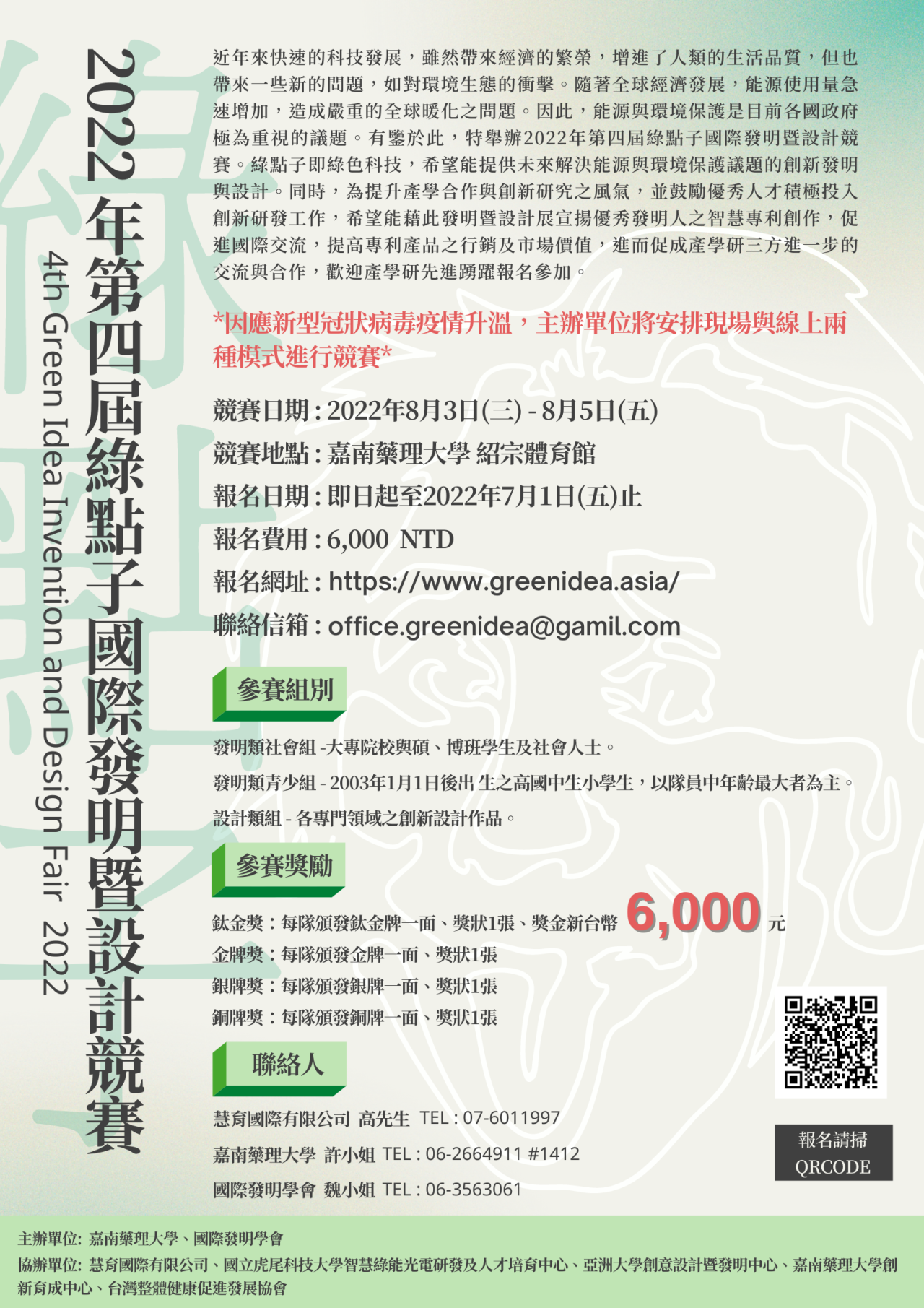 轉知:嘉藥學校財團法人嘉南藥理大學辦理「2022年綠點子國際發明暨設計競賽」活動海報。