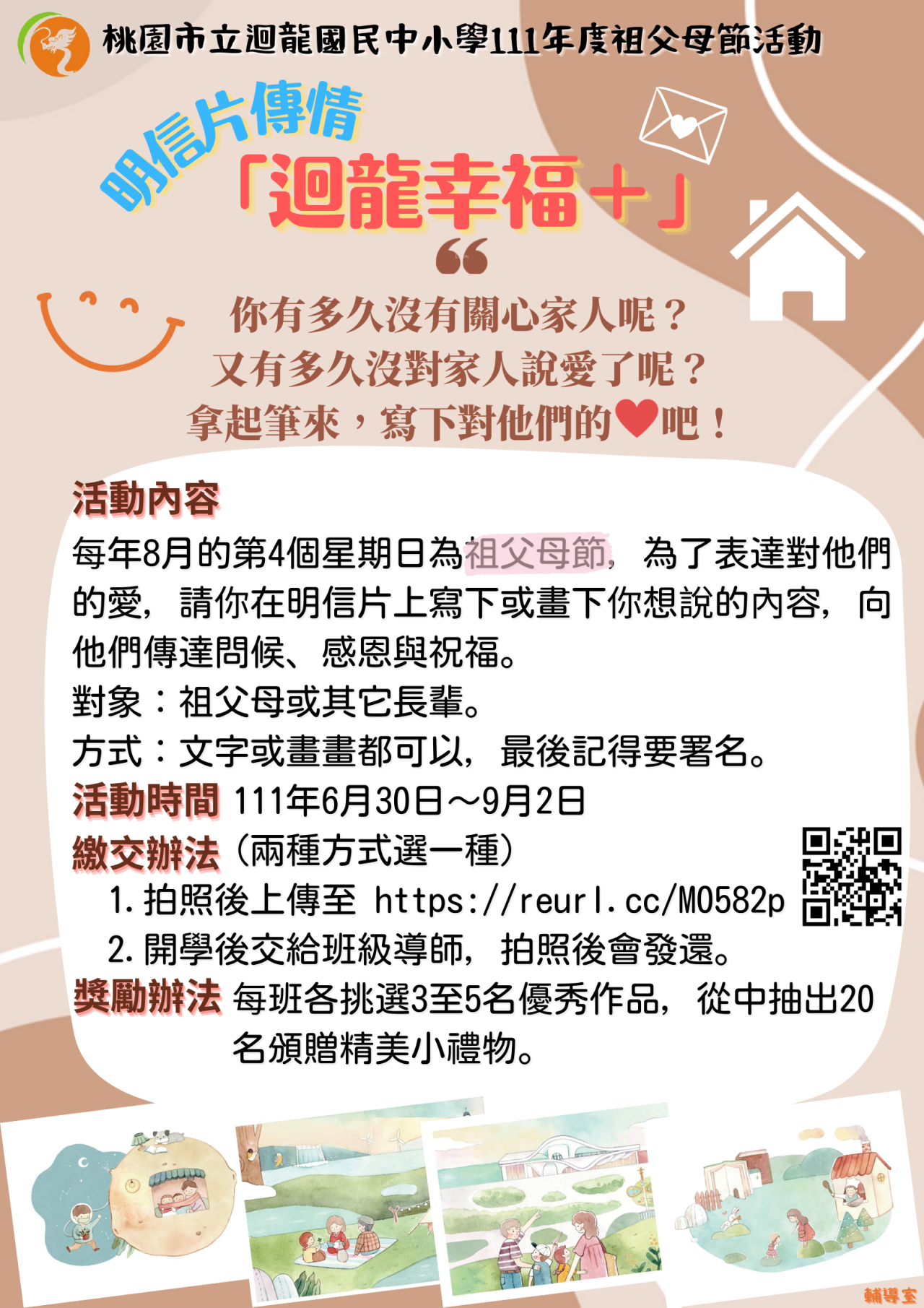 - 目的:面臨新冠病毒已經兩年半,在一波未平、一波又起的疫情下,許多家庭面臨了家人的離別,也學會更珍惜與家人相處的時間。藉由一年一度的祖父母節,辦理「明信片傳情.迴龍幸福+」活動,透過書寫明信片,增進學生們與家人的聯繫及互動,引發學生及家長重視家庭關係,並尊敬長者之生命經驗與智慧,留下與家人相處的幸福時刻。