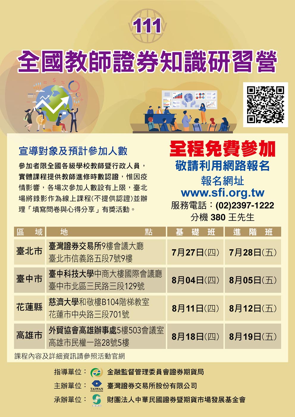 三、 旨揭活動各場次自即日起至111年8月19日,全程免費參加,參與教師可獲得教師研習時數,詳情請至該基金會網站「全國教師證券知識研習營」專區查詢( 網址為https://webline.sfi.org.tw/workshop/Default.asp?csn=578),洽詢電話02-23971222分機380王先生。
