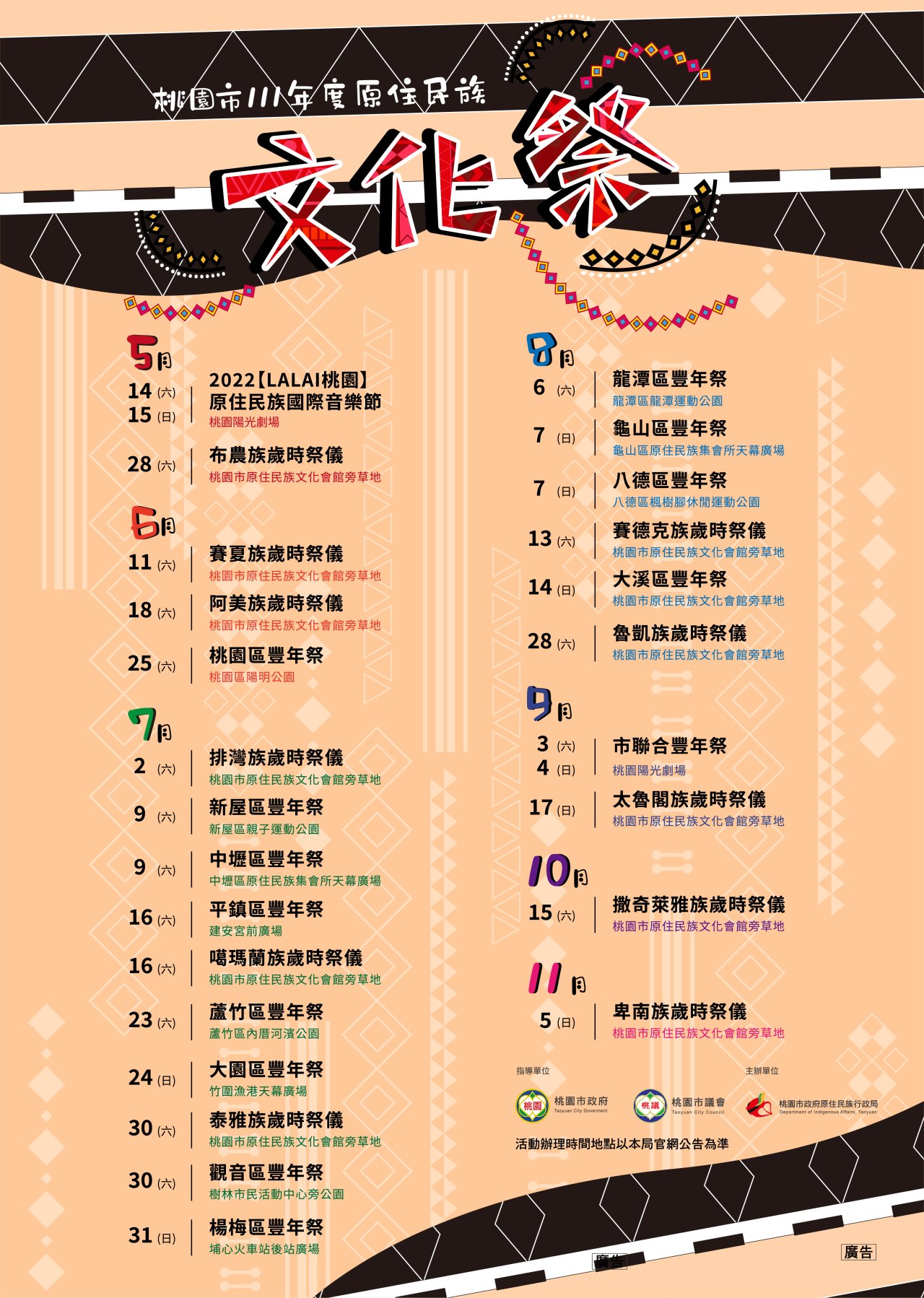 因疫情影響,本市原住民族歲時祭儀延期舉行情形如下,其餘族群時間不變: |
