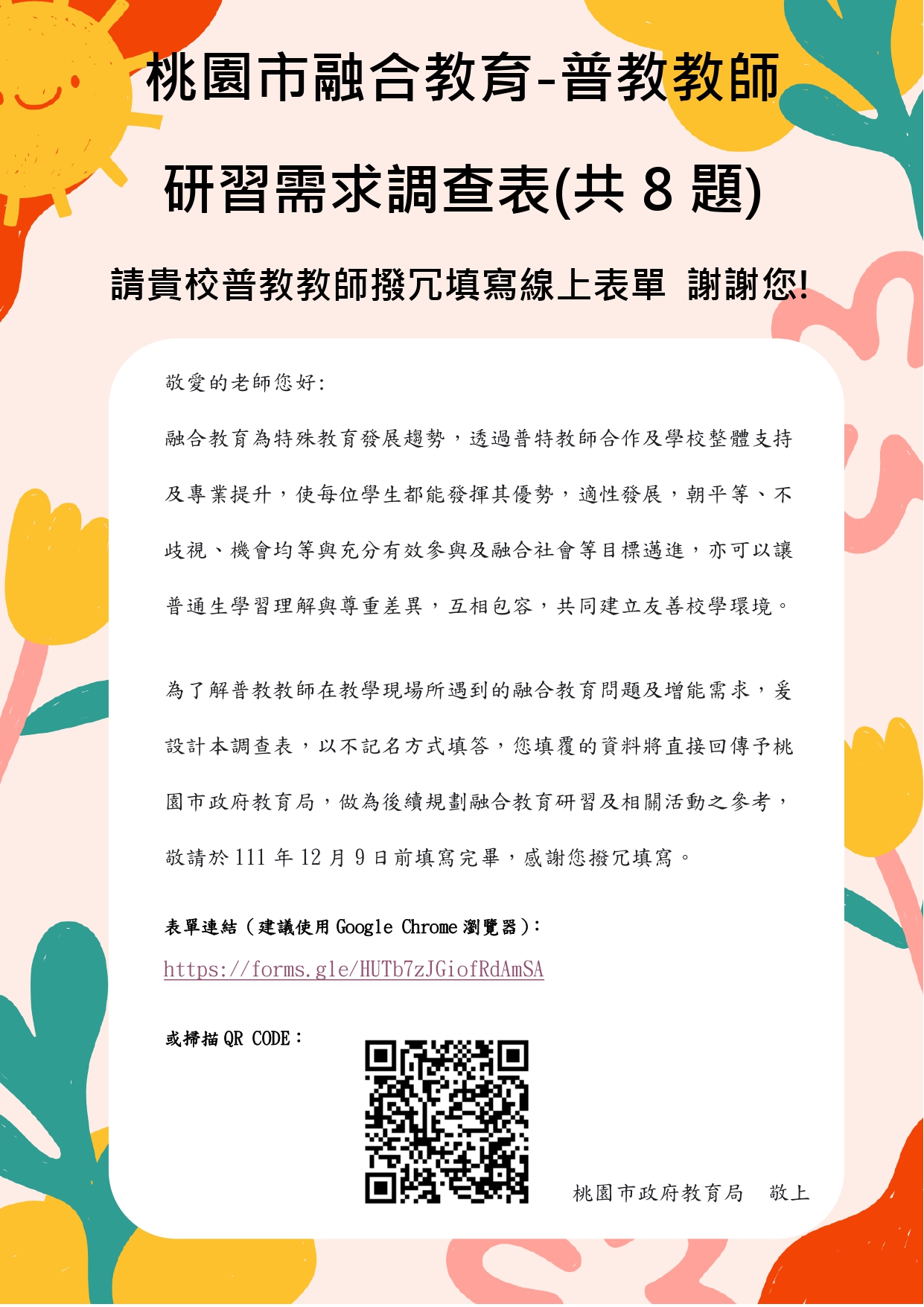 二、桃園市政府教育局為了解本市普教教師於教學現場所遇融合教育問題及增能需求,爰請普教教師於111年12月9日前協助填寫調查表(表單連結:https://forms.gle/HUTb7zJGiofRdAmSA),教育局將依本調查表之結果做為後續規劃研習及相關活動之參考。