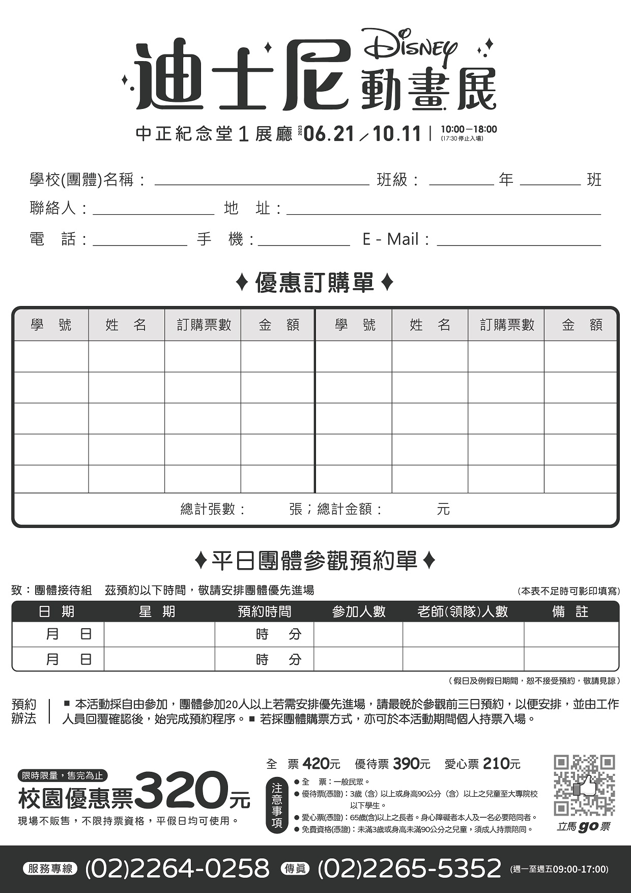 本案聯絡人:活動推廣部校園優惠票。服務專線:(02)2264-0258(代表號)。傳真:(02)2265-5352。 |
