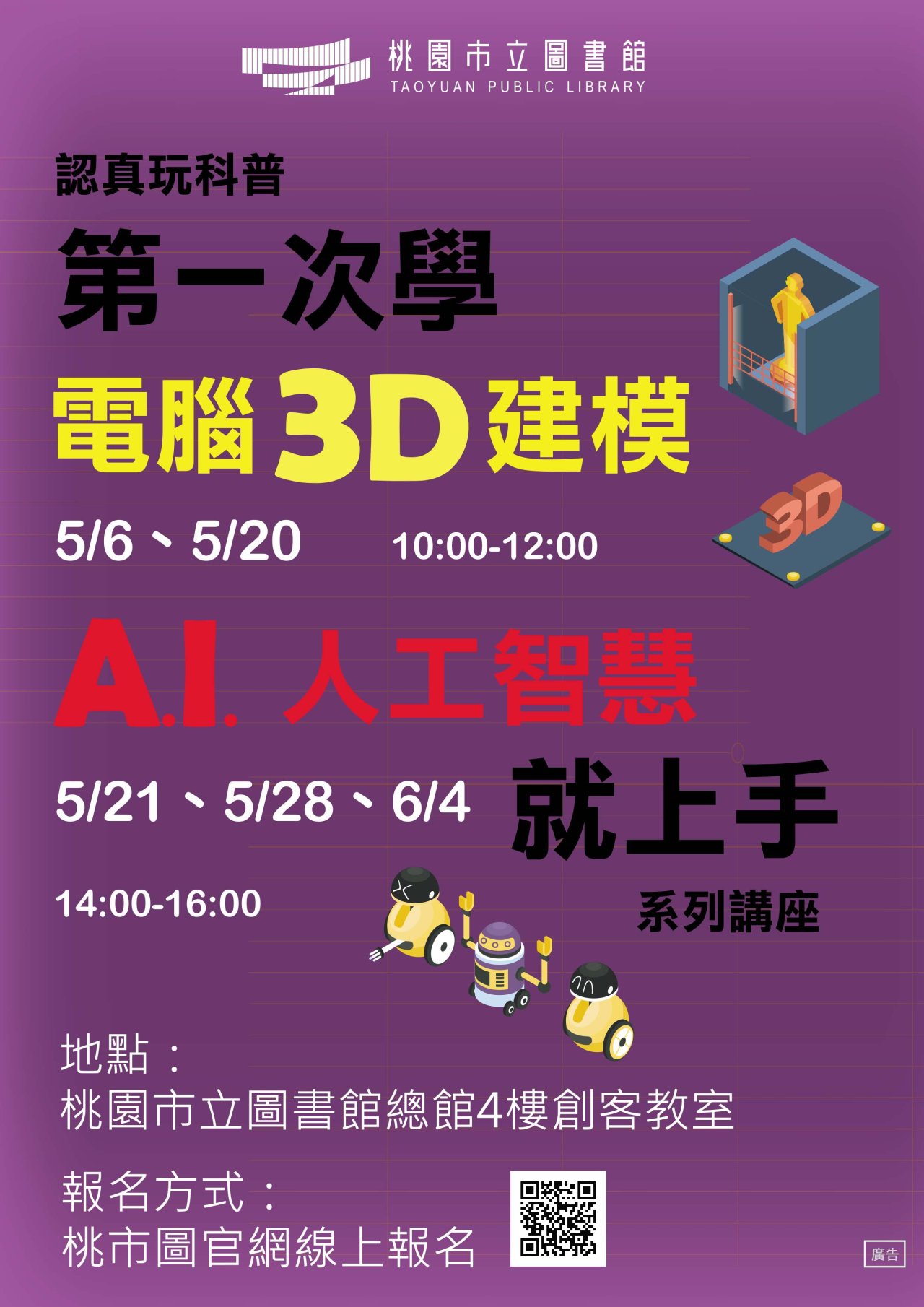 轉知桃園市立圖書館辦理「第一次學3D建構與AI知識就上手系列課程」海報電子檔