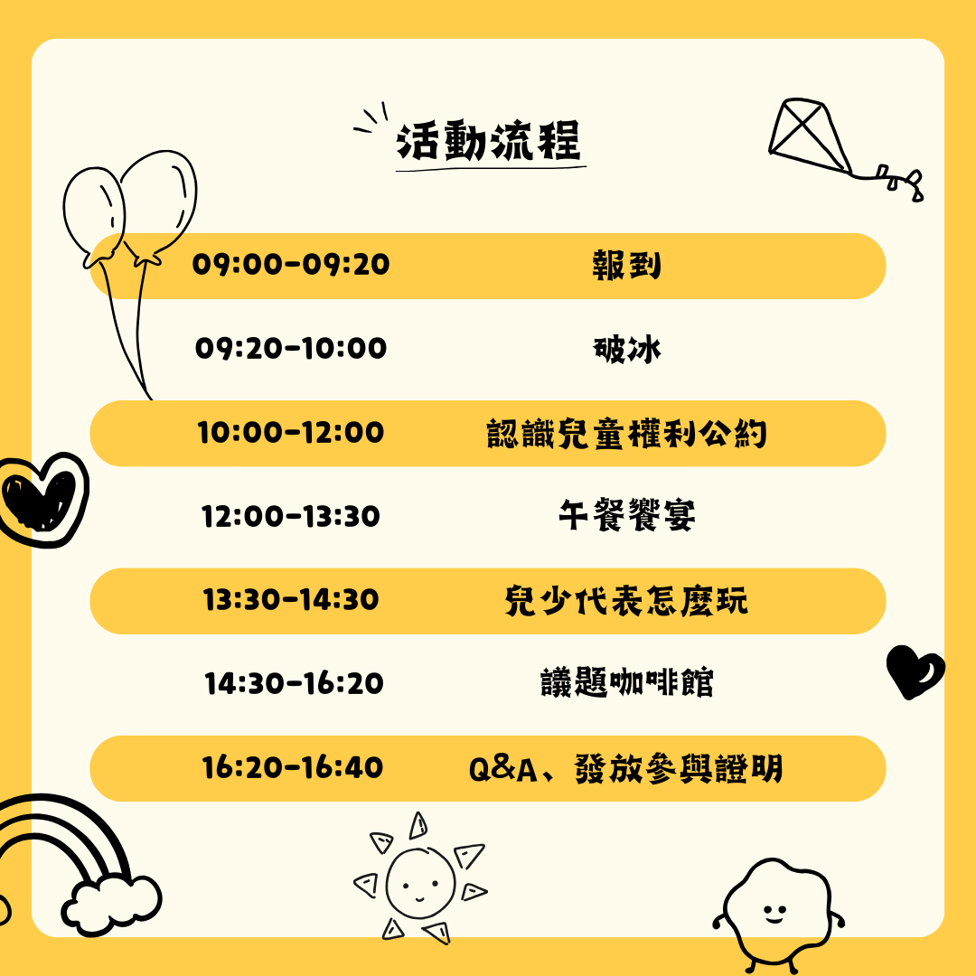 二、 | 為持續推動本市兒童及少年(下稱兒少)參與公共事務,落實兒少表意權,本次活動亦邀請兒少共同參與,透過兒童權利公約講座、兒少代表任內心得分享及議題咖啡館等多元形式,讓兒少認識兒童權利公約相關知識,並加深對於兒少代表之印象。 |
