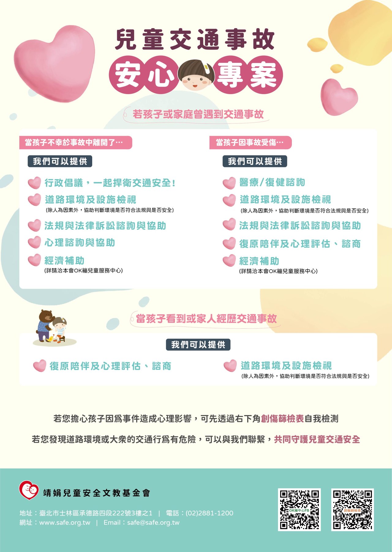 轉知財團法人靖娟兒童安全文教基金會(靖娟基金會)「兒少交通事故安心專案」相關服務宣導資訊