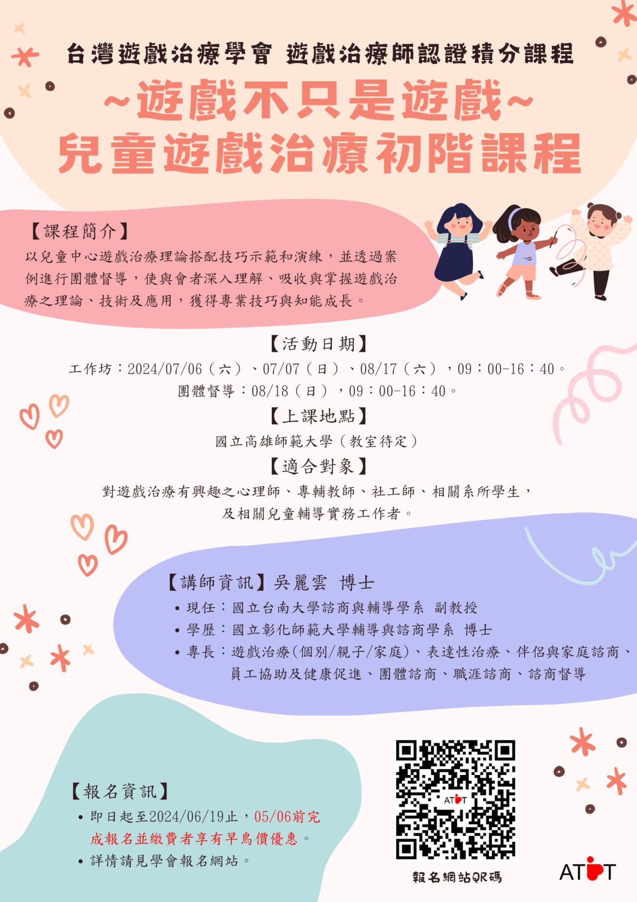 台灣遊戲治療學會將於113年7月6、7日及8月17、18日舉辦2024台灣遊戲治療師認證積分課程『遊戲不只是遊戲』兒童遊戲治療入門課程