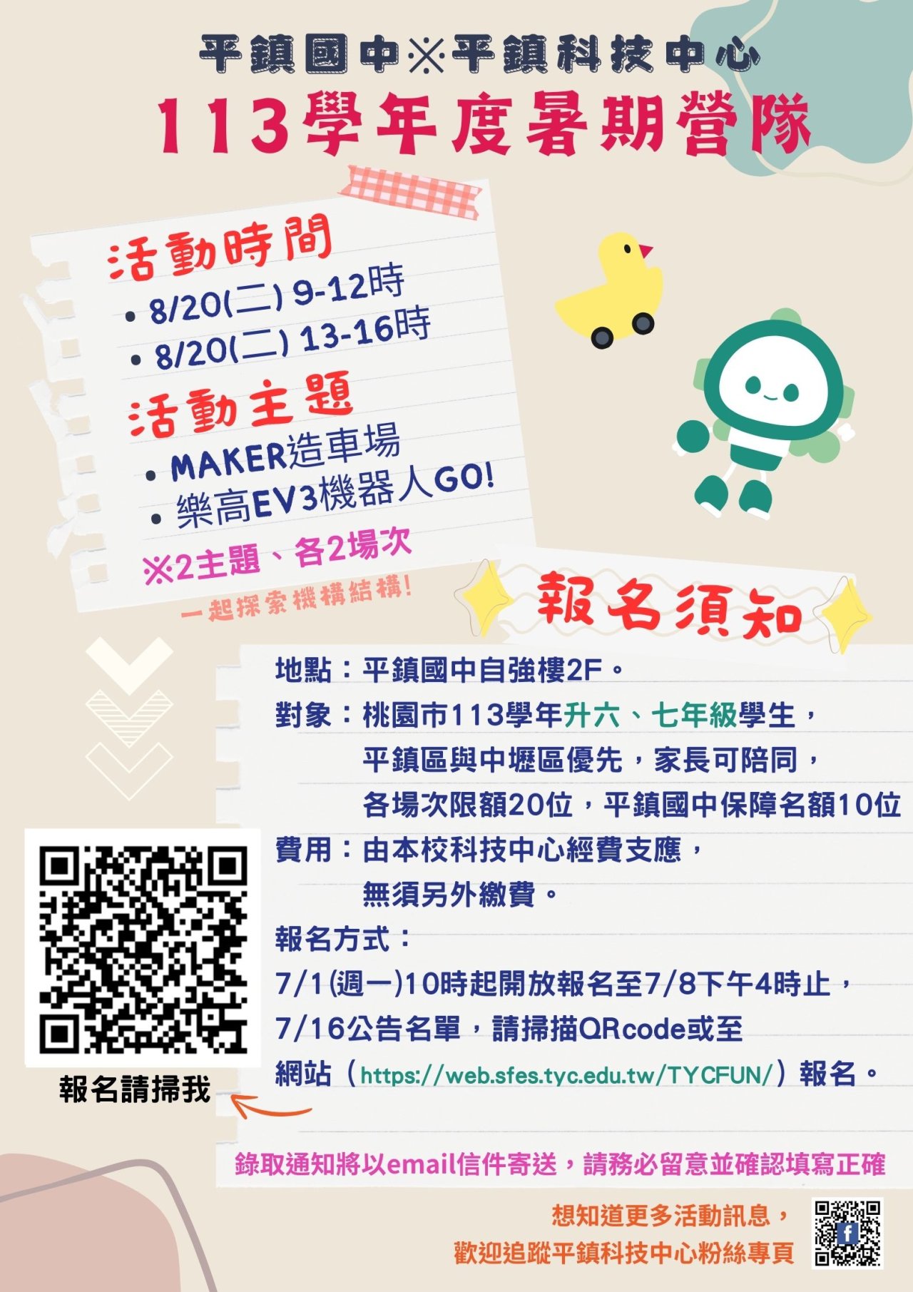 轉知:平鎮國中辦理平鎮自造教育及科技中心113年暑假營隊。